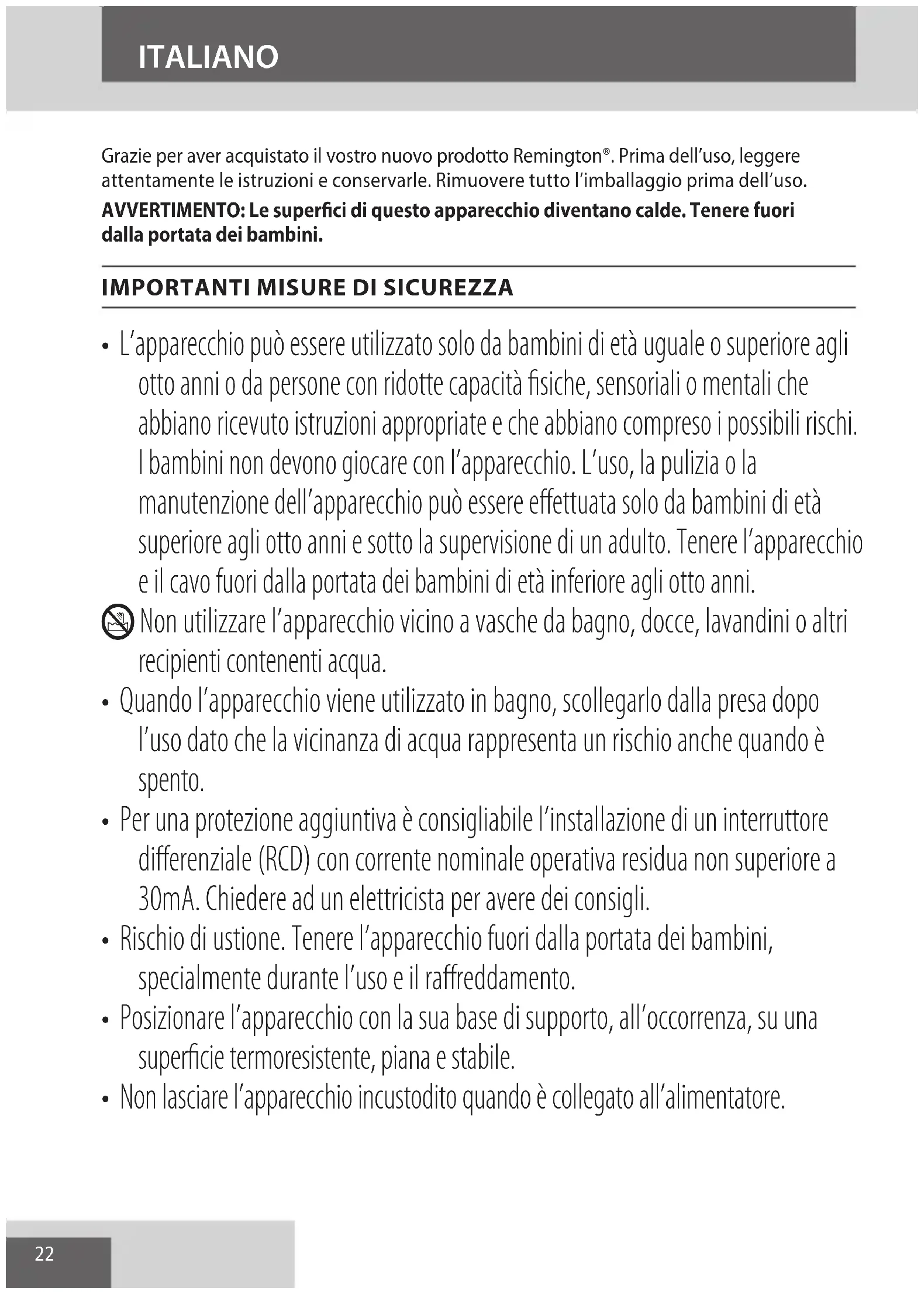AE22 ITALIANO Grazie per aver acquistato il vostro nuovo prodotto Remington®. Prima dell’uso, leggere attentamente le istruzioni e conservarle. Rimuovere tutto l’imballaggio prima dell’uso. AVVERTIMENTO: Le superci di questo apparecchio diventano calde. Tenere fuori dalla portata dei bambini.