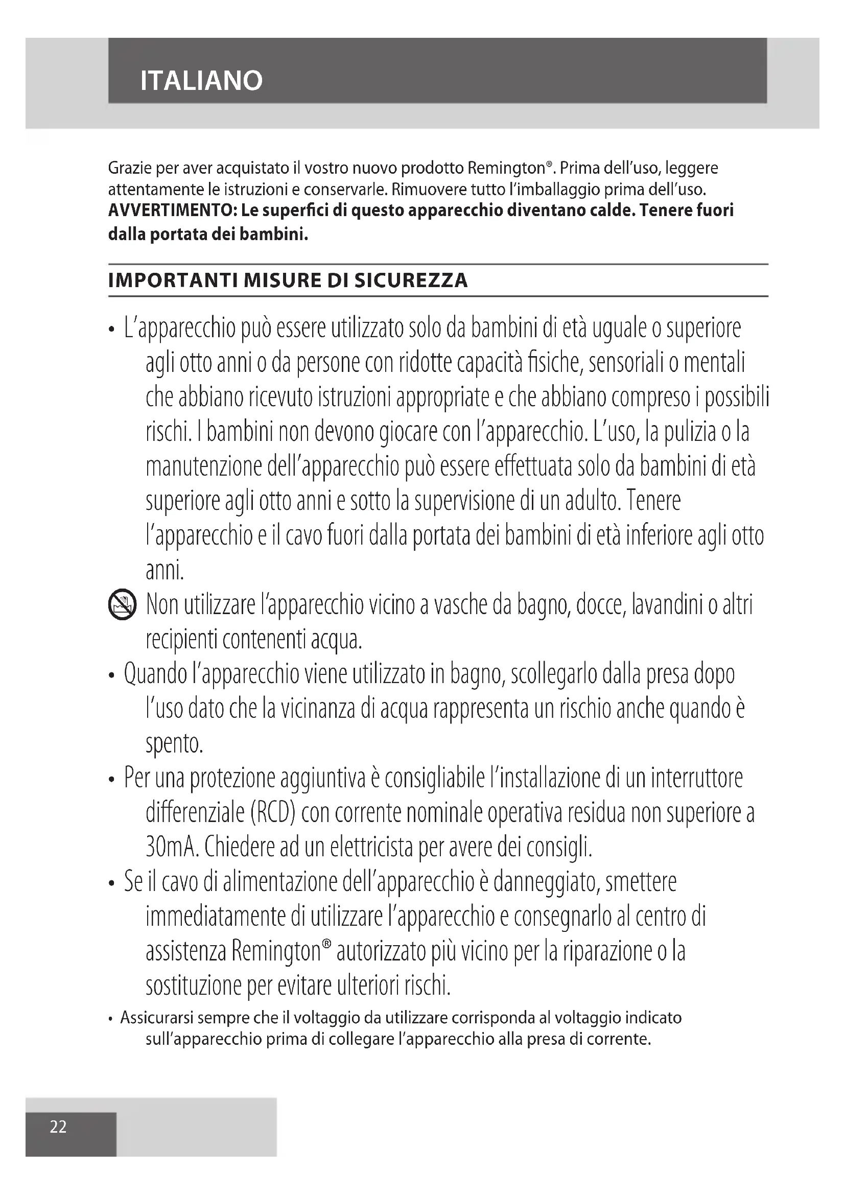 AE22 Grazie per aver acquistato il vostro nuovo prodotto Remington®. Prima dell’uso, leggere attentamente le istruzioni e conservarle. Rimuovere tutto l’imballaggio prima dell’uso. AVVERTIMENTO: Le superfici di questo apparecchio diventano calde. Tenere fuori dalla portata dei bambini.