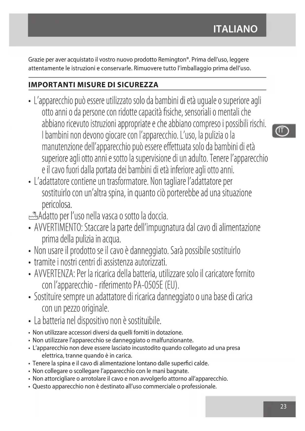 Per evitare problemi di salute ed ambientali dovuti a sostanze pericolose, gli apparecchi e le batterie ricaricabili e non ricaricabili contrassegnati con uno di questi simboli non devono essere smaltiti con i riuti urbani indierenziati. Smaltire i prodotti elettrici ed elettronici e, quando possibile, le batterie ricaricabili e non ricaricabili, in un punto di raccolta autorizzato per il riciclo/la raccolta.27 Tak for at have købt dit nye produkt fra Remington®. Læs venligst denne vejledning omhyggeligt før brug og bevar den godt. Fjern al emballage før brug. VIGTIGE SIKKERHEDSFORANSTALTNINGER