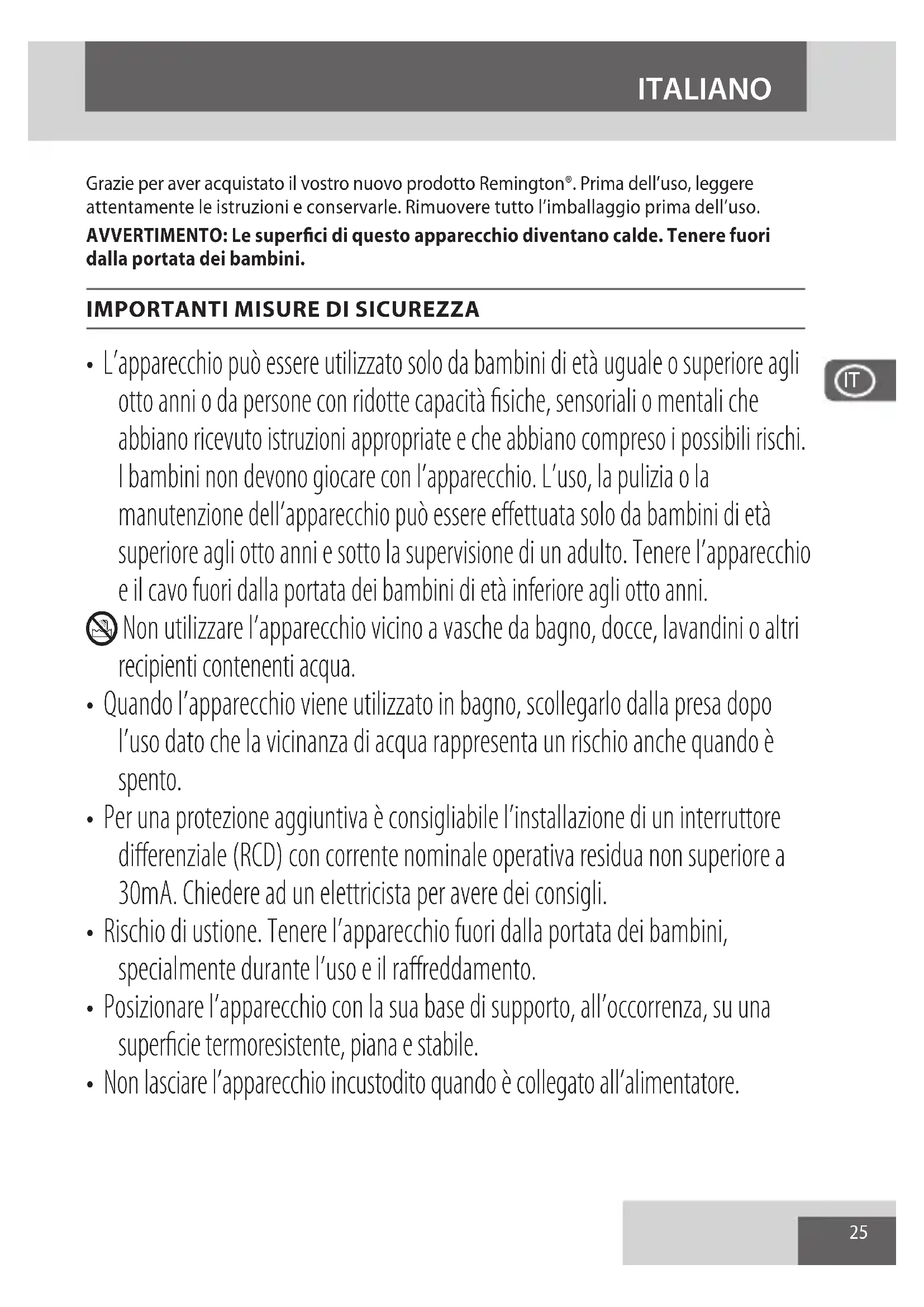 - Se il cavo di alimentazione dell’apparecchio è danneggiato, smettere immediatamente di utilizzare l’apparecchio e consegnarlo al centro di assistenza Remington® autorizzato più vicino per la riparazione o la sostituzione per evitare ulteriori rischi.