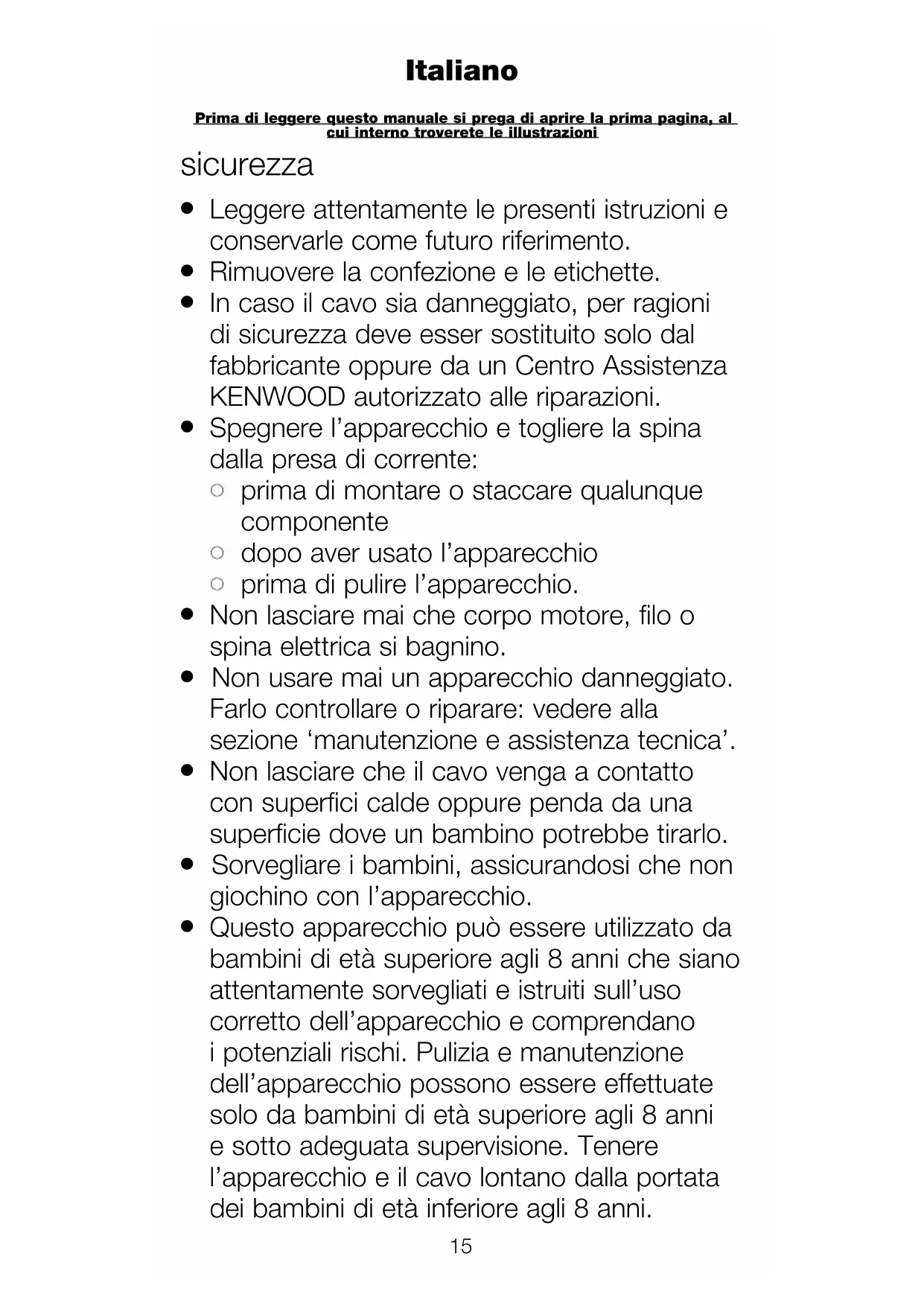 Questo apparecchio può essere utilizzato da bambini di età superiore agli 8 anni che siano attentamente sorvegliati e istruiti sull’uso corretto dell’apparecchio e comprendano i potenziali rischi. Pulizia e manutenzione dell’apparecchio possono essere effettuate solo da bambini di età superiore agli 8 anni e sotto adeguata supervisione. Tenere l’apparecchio e il cavo lontano dalla portata dei bambini di età inferiore agli 8 anni. Prima di leggere questo manuale si prega di aprire la prima pagina, al cui interno troverete le illustrazioni Italiano16