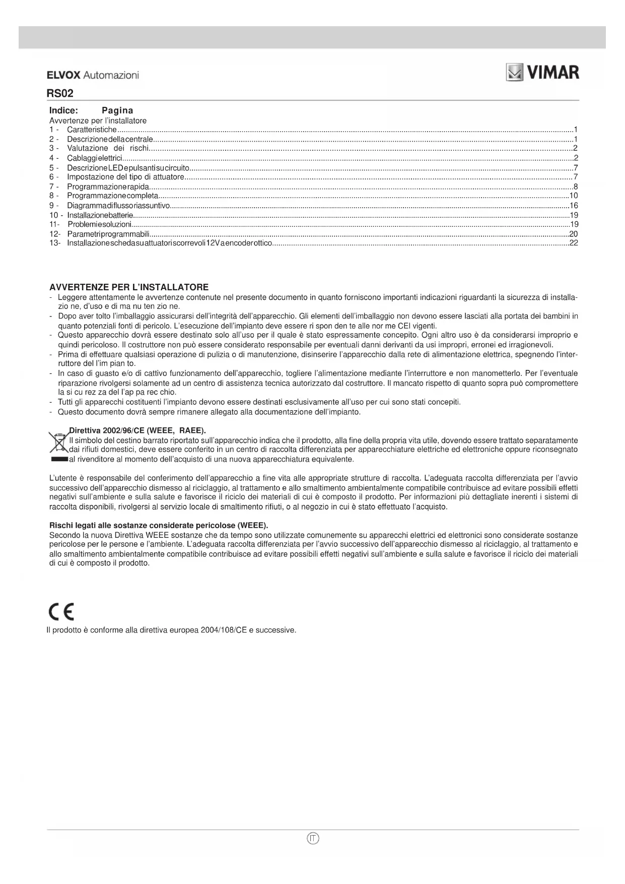 Dopo aver tolto l’imballaggio assicurarsi dell’integrità del l’ap pa rec chio. Gli ele men ti dell’imballaggio non devono essere lasciati alla portata dei bambini in quanto potenziali fonti di pericolo. L’esecuzione dell’impianto deve essere ri spon den te alle nor me CEI vigenti. - Questo ap pa rec chio dovrà essere de sti na to solo all’uso per il quale è stato espres sa men te concepito. Ogni altro uso è da con si de rar si im pro prio e quindi pericoloso. Il costruttore non può essere con si de ra to re spon sa bi le per even tua li danni derivanti da usi impropri, erronei ed ir ra gio ne vo li. - Prima di ef fet tua re qual si a si operazione di pu li zia o di ma nu ten zio ne, disinserire l’apparecchio dalla rete di ali men ta zio ne elettrica, spe gnen do l’inter- ruttore del l’im pian to. - In caso di guasto e/o di cattivo fun zio na men to del l’ap pa rec chio, togliere l’ali men ta zio ne me dian te l’interruttore e non ma no met ter lo. Per l’even tua le ri pa ra zio ne ri vol ger si so la men te ad un centro di assistenza tecnica autorizzato dal costruttore. Il mancato ri spet to di quanto so pra può com pro met te re la si cu rez za del l’ap pa rec chio. - Tutti gli apparecchi costituenti l’impianto devono essere de sti na ti esclu si va men te all’uso per cui sono stati con ce pi ti. - Questo do cu men to dovrà sem pre ri ma ne re allegato alla do cu men ta zio ne dell’impianto. Direttiva 2002/96/CE (WEEE, RAEE). Il simbolo del cestino barrato riportato sull’apparecchio indica che il prodotto, alla fine della propria vita utile, dovendo essere trattato separatamente dai rifiuti domestici, deve essere conferito in un centro di raccolta differenziata per apparecchiature elettriche ed elettroniche oppure riconsegnato al rivenditore al momento dell’acquisto di una nuova apparecchiatura equivalente. L’utente è responsabile del conferimento dell’apparecchio a fine vita alle appropriate strutture di raccolta. L’adeguata raccolta differenziata per l’avvio successivo dell’apparecchio dismesso al riciclaggio, al trattamento e allo smaltimento ambientalmente compatibile contribuisce ad evitare possibili effetti negativi sull’ambiente e sulla salute e favorisce il riciclo dei materiali di cui è composto il prodotto. Per informazioni più dettagliate inerenti i sistemi di raccolta disponibili, rivolgersi al servizio locale di smaltimento rifiuti, o al negozio in cui è stato effettuato l’acquisto. Rischi legati alle sostanze considerate pericolose (WEEE). Secondo la nuova Direttiva WEEE sostanze che da tempo sono utilizzate comunemente su apparecchi elettrici ed elettronici sono considerate sostanze pericolose per le persone e l’ambiente. L’adeguata raccolta differenziata per l’avvio successivo dell’apparecchio dismesso al riciclaggio, al trattamento e allo smaltimento ambientalmente compatibile contribuisce ad evitare possibili effetti negativi sull’ambiente e sulla salute e favorisce il riciclo dei materiali di cui è composto il prodotto. Il prodotto è conforme alla direttiva europea 2004/108/CE e successive.1 RS02