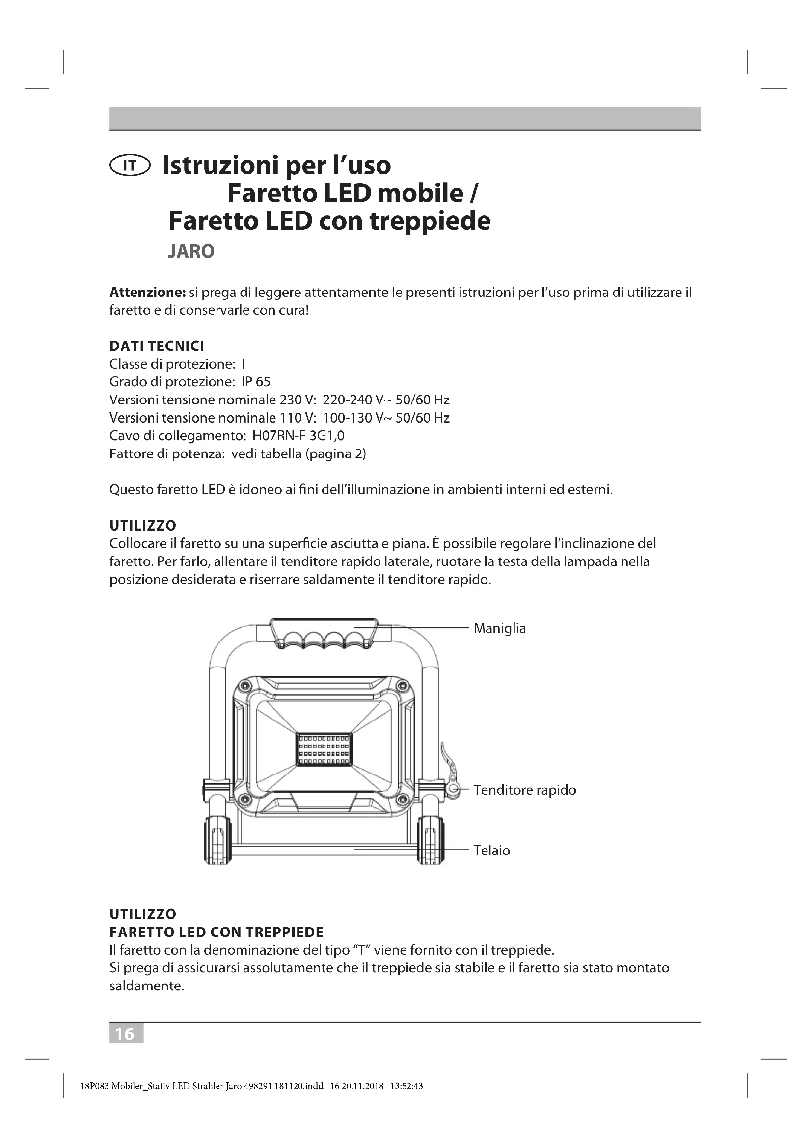 Il faretto con la denominazione del tipo “T” viene fornito con il treppiede. Si prega di assicurarsi assolutamente che il treppiede sia stabile e il faretto sia stato montato saldamente. 18P083 Mobiler_Stativ LED Strahler Jaro 498291 181120.indd 16 20.11.2018 13:52:4317 JARO Istruzioni per l’uso