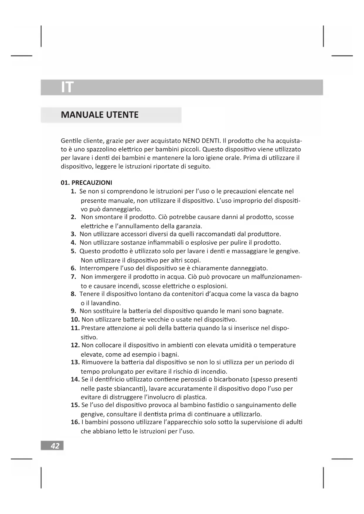 MANUALE UTENTE Genle cliente, grazie per aver acquistato NENO DENTI. Il prodoo che ha acquista- to è uno spazzolino elerico per bambini piccoli. Questo disposivo viene ulizzato per lavare i den dei bambini e mantenere la loro igiene orale. Prima di ulizzare il disposivo, leggere le istruzioni riportate di seguito.