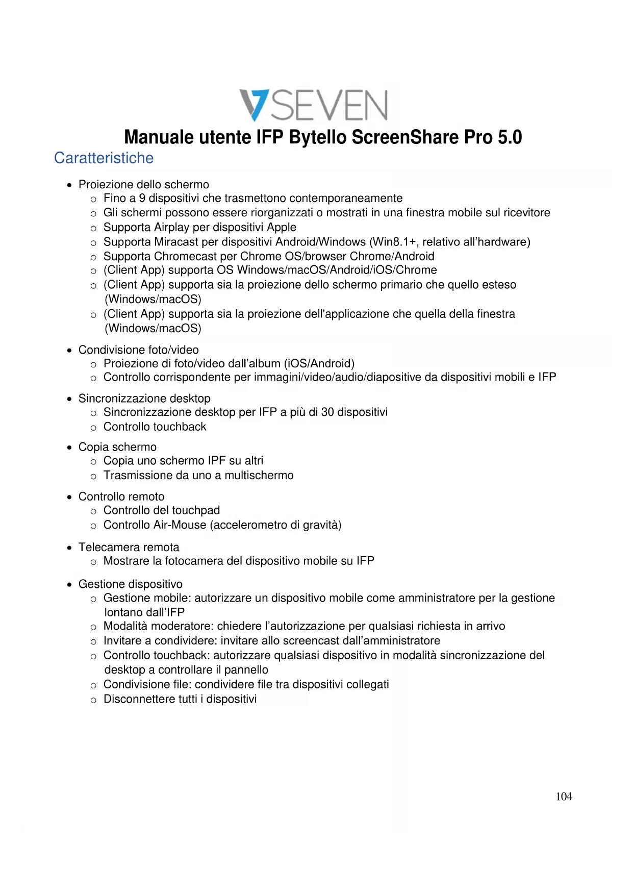 Caratteristiche Proiezione dello schermo o Fino a 9 dispositivi che trasmettono contemporaneamente o Gli schermi possono essere riorganizzati o mostrati in una finestra mobile sul ricevitore o Supporta Airplay per dispositivi Apple o Supporta Miracast per dispositivi Android/Windows (Win8.1+, relativo all’hardware) o Supporta Chromecast per Chrome OS/browser Chrome/Android o (Client App) supporta OS Windows/macOS/Android/iOS/Chrome o (Client App) supporta sia la proiezione dello schermo primario che quello esteso (Windows/macOS) o (Client App) supporta sia la proiezione dell'applicazione che quella della finestra (Windows/macOS) Condivisione foto/video o Proiezione di foto/video dall’album (iOS/Android) o Controllo corrispondente per immagini/video/audio/diapositive da dispositivi mobili e IFP Sincronizzazione desktop o Sincronizzazione desktop per IFP a più di 30 dispositivi o Controllo touchback Copia schermo o Copia uno schermo IPF su altri o Trasmissione da uno a multischermo Controllo remoto o Controllo del touchpad o Controllo Air-Mouse (accelerometro di gravità) Telecamera remota o Mostrare la fotocamera del dispositivo mobile su IFP Gestione dispositivo o Gestione mobile: autorizzare un dispositivo mobile come amministratore per la gestione lontano dall’IFP o Modalità moderatore: chiedere l’autorizzazione per qualsiasi richiesta in arrivo o Invitare a condividere: invitare allo screencast dall’amministratore o Controllo touchback: autorizzare qualsiasi dispositivo in modalità sincronizzazione del desktop a controllare il pannello o Condivisione file: condividere file tra dispositivi collegati o Disconnettere tutti i dispositiviManuale utente IFP Bytello ScreenShare Pro 5.0