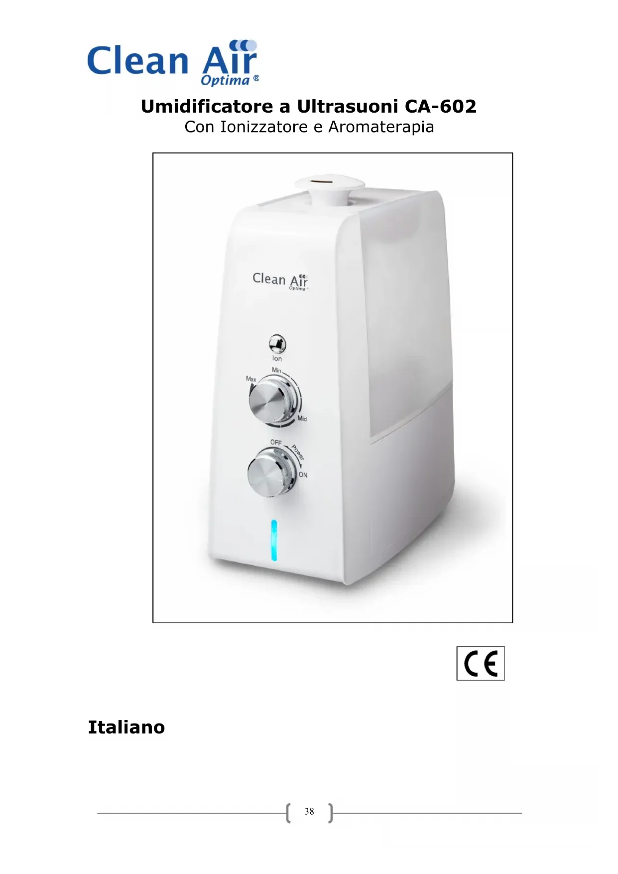 Italiano39 Grazie per aver acquistato l'innovativo umidificatore a ultrasuoni Clean Air Optima CA-602 con ionizzatore. Vi auguriamo molti anni di aria interna sana con questo prodotto efficiente ed efficace. Assicurarsi che tutte le precauzioni di sicurezza siano rispettate durante l'utilizzo di questo apparecchio elettrico per garantirne il corretto funzionamento. Queste istruzioni descrivono le precauzioni di sicurezza da osservare durante il funzionamento. Sono progettate per prevenire lesioni o danni a questo apparecchio. Precauzioni di sicurezza Il trasduttore a ultrasuoni interno è estremamente sensibile. Non toccarlo a mani nude né graffiarlo con utensili metallici, altrimenti si ridurrà l'emissione di vapore. Per la pulizia di quest'area, utilizzare una piccola spazzola, un cotton fioc o uno spazzolino da denti. Non utilizzare acqua calda poiché potrebbe danneggiare le parti nebulizzatrici. Utilizzare una tensione adeguata: CA 110~120 V 60 Hz in Canada/USA; CA 220~240 V 50 Hz in Europa. L'uso di una tensione non corretta può causare rischi di incendio o scosse elettriche. Per evitare scosse elettriche, non smontare, riparare o modificare questo prodotto. La manutenzione e la pulizia devono essere eseguite esattamente come indicato nel presente manuale. In caso di malfunzionamento, contattare un centro di manutenzione Clean Air Optima autorizzato. Non utilizzare in aree in cui sono conservati materiali infiammabili o esplosivi. Non posizionare questo dispositivo alla luce diretta del sole o vicino a oggetti che generano calore ad alta temperatura. Il calore può causare deformazioni o deformazioni dell'involucro esterno. Non utilizzare l'umidificatore in una stanza con livelli di umidità relativa superiori al 50%. Un'umidità eccessiva nella stanza provoca condensa su superfici fredde come pareti o finestre. Non utilizzare l'unità senza acqua nella vaschetta. Non inserire oggetti estranei nel dispositivo. Non toccare il trasduttore o la vaschetta inferiore dell'acqua quando l'unità è in funzione. Non graffiare il trasduttore. Non toccare l'uscita del vapore quando si produce vapore caldo. Non immergere il dispositivo in acqua. Acqua o detergenti possono essere utilizzati solo sulle parti da pulire secondo le istruzioni di pulizia e manutenzione. Utilizzare solo anticalcare o aceto per rimuovere i depositi minerali dalla vaschetta o dal trasduttore. Non utilizzare detergenti aggressivi che potrebbero danneggiare l'unità. In caso di odore anomalo, spegnere e scollegare l'unità e contattare l'assistenza tecnica Clean Air Optima. Pulire e asciugare il dispositivo prima di riporlo (rimuovendo anche tutta l'acqua dall'interno). Conservare la macchina in un luogo fresco e asciutto, fuori dalla portata dei bambini. Non utilizzare tessuti o altri materiali per coprire il dispositivo. Prese e uscite dell'aria ostruite comprometteranno il funzionamento improprio dell'unità e potrebbero causare incendi o altri danni. Per evitare interferenze e danni ad altri dispositivi elettronici, posizionare il dispositivo ad almeno 1 metro di distanza da computer, televisori, radio o altre apparecchiature elettroniche. L'umidificatore a ultrasuoni deve essere pulito regolarmente per garantirne il corretto funzionamento e una lunga durata. Consultare le istruzioni per la pulizia. Le vibrazioni ad alta frequenza non possono essere udite da persone o animali e sono completamente sicure. Per motivi di sicurezza e per prevenire incendi o scosse elettriche, scollegare il cavo di alimentazione dalla presa elettrica ogni volta che: