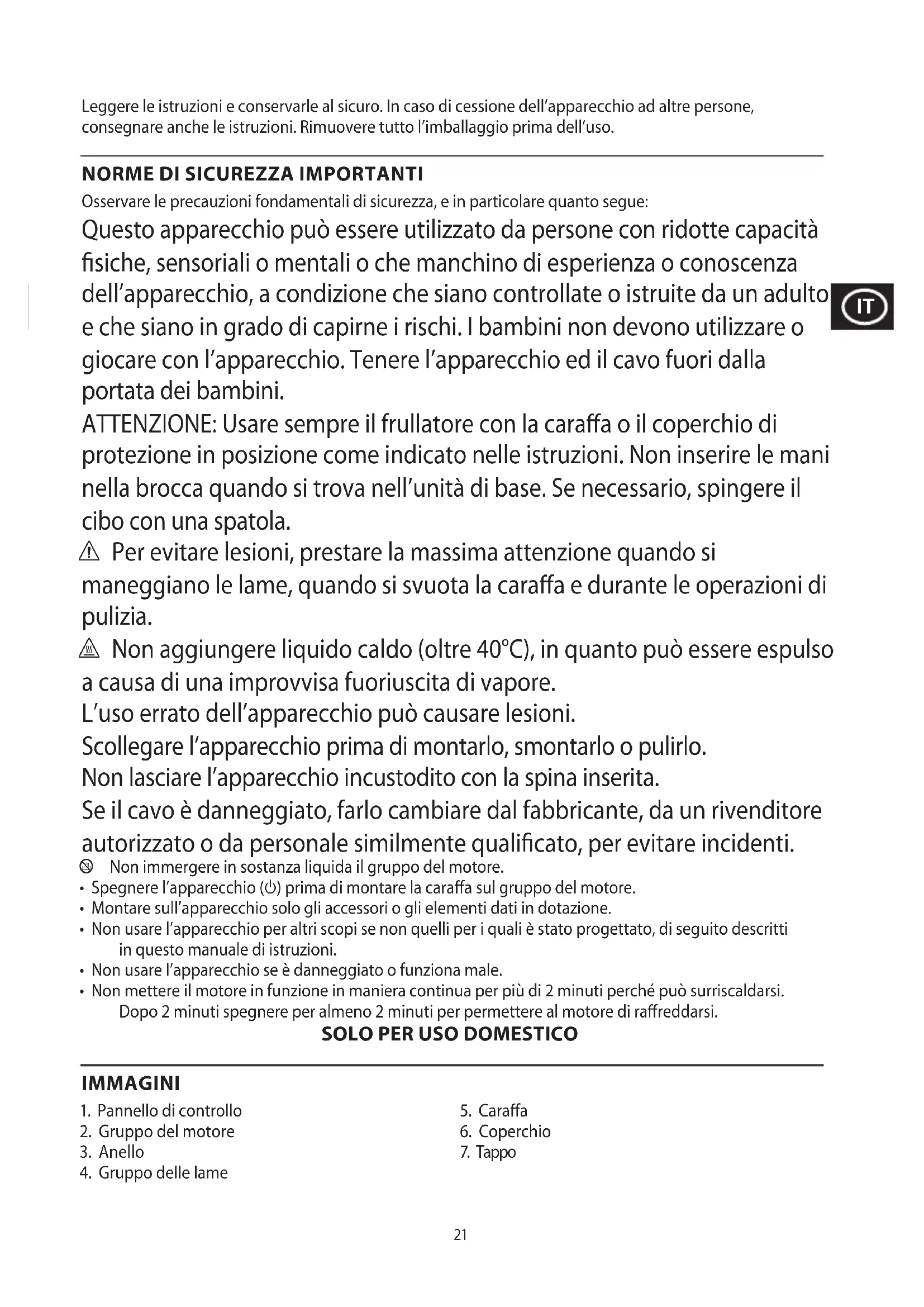 Osservare le precauzioni fondamentali di sicurezza, e in particolare quanto segue: Questo apparecchio può essere utilizzato da persone con ridotte capacità siche, sensoriali o mentali o che manchino di esperienza o conoscenza dell’apparecchio, a condizione che siano controllate o istruite da un adulto e che siano in grado di capirne i rischi. I bambini non devono utilizzare o giocare con l’apparecchio. Tenere l’apparecchio ed il cavo fuori dalla portata dei bambini. ATTENZIONE: Usare sempre il frullatore con la caraa o il coperchio di protezione in posizione come indicato nelle istruzioni. Non inserire le mani nella brocca quando si trova nell’unità di base. Se necessario, spingere il cibo con una spatola. c Per evitare lesioni, prestare la massima attenzione quando si maneggiano le lame, quando si svuota la caraa e durante le operazioni di pulizia. h Non aggiungere liquido caldo (oltre 40°C), in quanto può essere espulso a causa di una improvvisa fuoriuscita di vapore. L’uso errato dell’apparecchio può causare lesioni. Scollegare l’apparecchio prima di montarlo, smontarlo o pulirlo. Non lasciare l’apparecchio incustodito con la spina inserita. Se il cavo è danneggiato, farlo cambiare dal fabbricante, da un rivenditore autorizzato o da personale similmente qualicato, per evitare incidenti. l Non immergere in sostanza liquida il gruppo del motore.