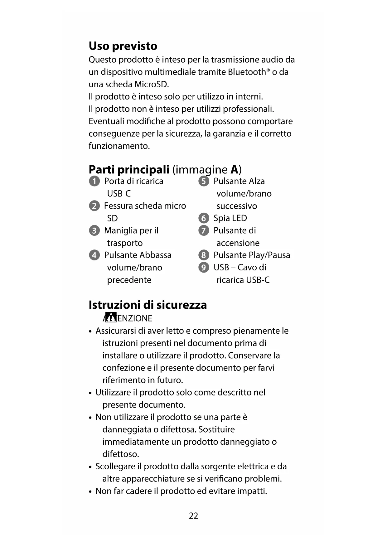 3 Maniglia per il trasporto 4 Pulsante Abbassa volume/brano precedente 5 Pulsante Alza volume/brano successivo 6 Spia LED 7 Pulsante di accensione 8 Pulsante Play/Pausa 9 USB – Cavo di ricarica USB-C Istruzioni di sicurezza