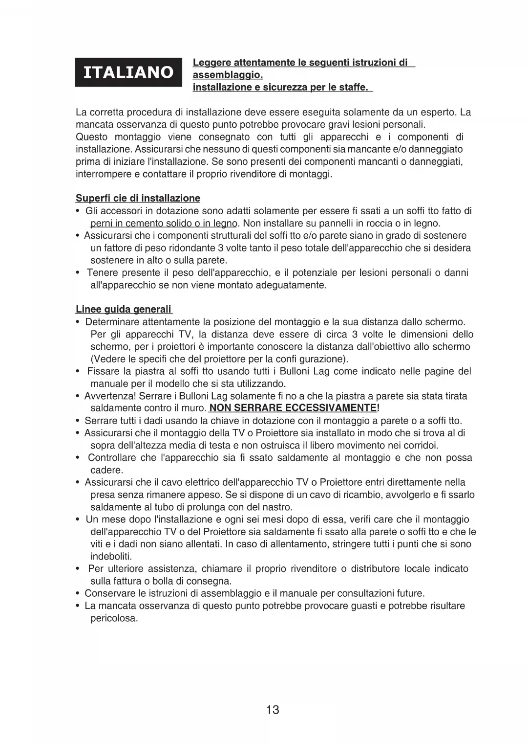 - Alle logo's, merken en productnamen zijn handelsmerken of geregistreerde handelsmerken van de respectievelijke eigenaren en worden hierbij als zodanig erkend.13 Leggere attentamente le seguenti istruzioni di assemblaggio, installazione e sicurezza per le staffe. La corretta procedura di installazione deve essere eseguita solamente da un esperto. La mancata osservanza di questo punto potrebbe provocare gravi lesioni personali. Questo montaggio viene consegnato con tutti gli apparecchi e i componenti di installazione. Assicurarsi che nessuno di questi componenti sia mancante e/o danneggiato prima di iniziare l'installazione. Se sono presenti dei componenti mancanti o danneggiati, interrompere e contattare il proprio rivenditore di montaggi. Superfi cie di installazione