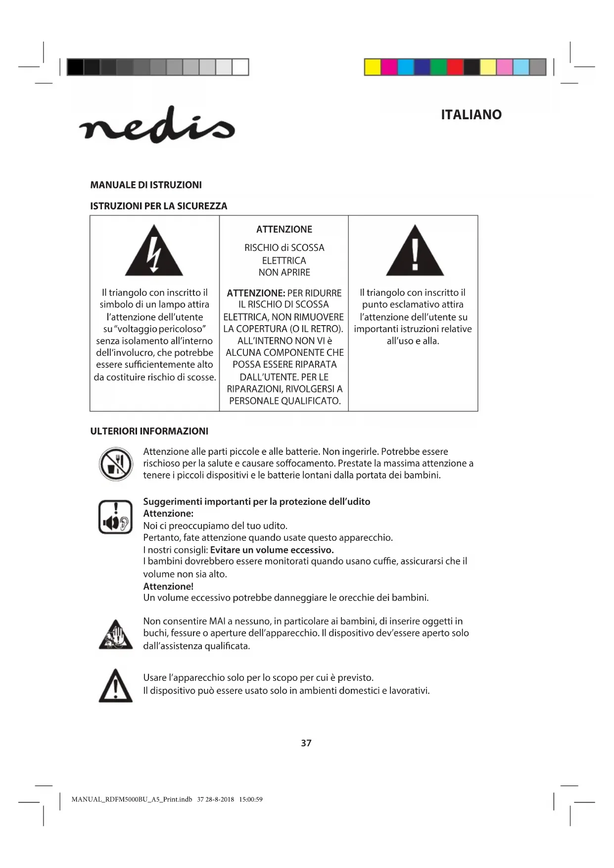 PERSONALE QUALIFICATO. Il triangolo con inscritto il punto esclamativo attira l’attenzione dell’utente su importanti istruzioni relative all’uso e alla. ULTERIORI INFORMAZIONI Attenzione alle parti piccole e alle batterie. Non ingerirle. Potrebbe essere rischioso per la salute e causare soocamento. Prestate la massima attenzione a tenere i piccoli dispositivi e le batterie lontani dalla portata dei bambini. Suggerimenti importanti per la protezione dell’udito Attenzione: Noi ci preoccupiamo del tuo udito. Pertanto, fate attenzione quando usate questo apparecchio. I nostri consigli: Evitare un volume eccessivo. I bambini dovrebbero essere monitorati quando usano cue, assicurarsi che il volume non sia alto. Attenzione! Un volume eccessivo potrebbe danneggiare le orecchie dei bambini. Non consentire MAI a nessuno, in particolare ai bambini, di inserire oggetti in buchi, fessure o aperture dell’apparecchio. Il dispositivo dev’essere aperto solo dall’assistenza qualicata. Usare l’apparecchio solo per lo scopo per cui è previsto. Il dispositivo può essere usato solo in ambienti domestici e lavorativi. MANUAL_RDFM5000BU_A5_Print.indb 37 28-8-2018 15:00:5938 ITALIANO La invitiamo a conservare questo manuale per referenze future. Istruzioni per la protezione ambientale Non smaltire questo dispositivo con i riuti domestici al termine del suo ciclo di vita, consegnarlo presso un punto di raccolta per riciclaggio di dispositivi elettrici ed elettronici. Il simbolo sul prodotto, le istruzioni per l’uso e la confezione riportano istruzioni per lo smaltimento. I materiali sono riciclabili, come segnalato. Riciclando i prodotti, i materiali e grazie ad altre forme di riutilizzo di vecchi apparecchi, contribuisci in maniera importante alla protezione dell’ambiente. Chiedi presso l’amministrazione della tua zona per conoscere i luoghi di smaltimento autorizzati. Non impedire la ventilazione del dispositivo. Assicurarsi che non ci siano tende, giornali, mobili o altri oggetti a bloccare il sistema di ventilazione dell’apparecchio. Il sistema di ventilazione deve essere sempre libero da oggetti! Il surriscaldamento può causare danni gravi al dispositivo e ridurre la sua resa e durata di vita. Calore e tepore Non esporre il dispositivo alla luce diretta del sole. Assicurarsi che il dispositivo non sia vicino a fonti dirette di calore come termosifone o fuoco. Assicurarsi che le aperture delle ventole del dispositivo siano scoperte. Umidità e pulizia Questo dispositivo non è waterproof! Non immergere il lettore in acqua. Non fare entrare il lettore in contatto con l’acqua. Se dell’acqua dovesse entrare nel dispositivo potrebbe causare danni gravi. Non usare soluzioni detergenti contenenti alcol, ammoniaca, benzina o sostanze abrasive che potrebbero danneggiare l’apparecchio. Per pulire, usare un panno morbido e inumidito. Riciclaggio professionale Le batterie e l’imballaggio non fanno parte della vostra spazzatura casalinga. Le batterie devono essere passate ad un centro di raccolta per batterie usate. Separare i materiali delle confezioni usa e getta aiuta l’ambiente.