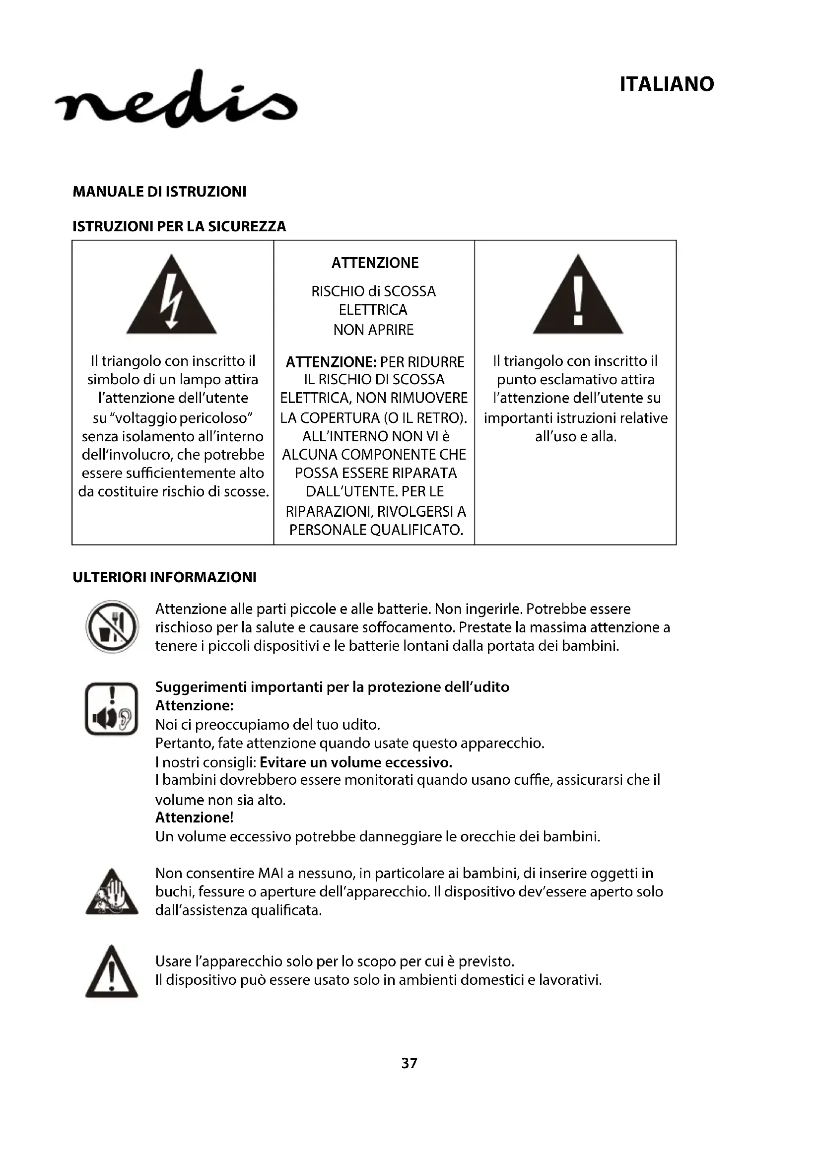 NON APRIRE Precauzioni di sicurezza: Per ridurre il rischio di scosse elettriche, il presente dispositivo deve essere aperto SOLO da un tecnico autorizzato, nel caso sia necessario ripararlo. Scollegare il prodotto dalla rete di alimentazione e da altri apparecchi se dovesse vericarsi un problema. Non esporre l’apparecchio ad acqua o umidità. Manutenzione: Pulire solo con un panno asciutto. Non utilizzare solventi detergenti o abrasivi. Garanzia: Non sarà accettata alcuna garanzia o responsabilità in relazione a cambiamenti e modiche apportate al prodotto o a danni determinati dall’uso non corretto del prodotto stesso. Informazioni generali: Il design e le caratteristiche tecniche sono soggetti a modica senza necessità di preavviso. Tutti i marchi, loghi e nomi dei prodotti sono marchi commerciali o registrati dei rispettivi titolari e sono riconosciuti come tali in questo documento. Conservare questo manuale e la confezione per riferimenti futuri. Attenzione: Il prodotto è contrassegnato con questo simbolo. con il quale si indica che i prodotti elettrici ed elettronici non devono essere gettati insieme ai riuti domestici. Per questi prodotti esiste un sistema di raccolta dierenziata. Il presente prodotto è stato realizzato e fornito in conformità a tutte le norme e le direttive vigenti, con validità in tutti gli stati membri della Comunità Europea. Inoltre è conforme alle speciche e alle normative applicabili nel paese in cui è stato venduto. La documentazione uciale è disponibile su richiesta. Essa include a titolo esemplicativo ma non limitativo: Dichiarazione di conformità (e di identità del prodotto), scheda di sicurezza dei materiali, rapporto di prova del prodotto. Contattare il nostro servizio clienti per assistenza: tramite il nostro sito web: http://www.nedis.it/it-it/contatti/modulo-contatto.htm tramite e-mail: service@nedis.com tramite telefono: +31 (0)73-5993965 (in orario di ucio) NEDIS B.V., De Tweeling 28, 5215 MC ’s-Hertogenbosch, Paesi Bassi45 ESPAÑOL