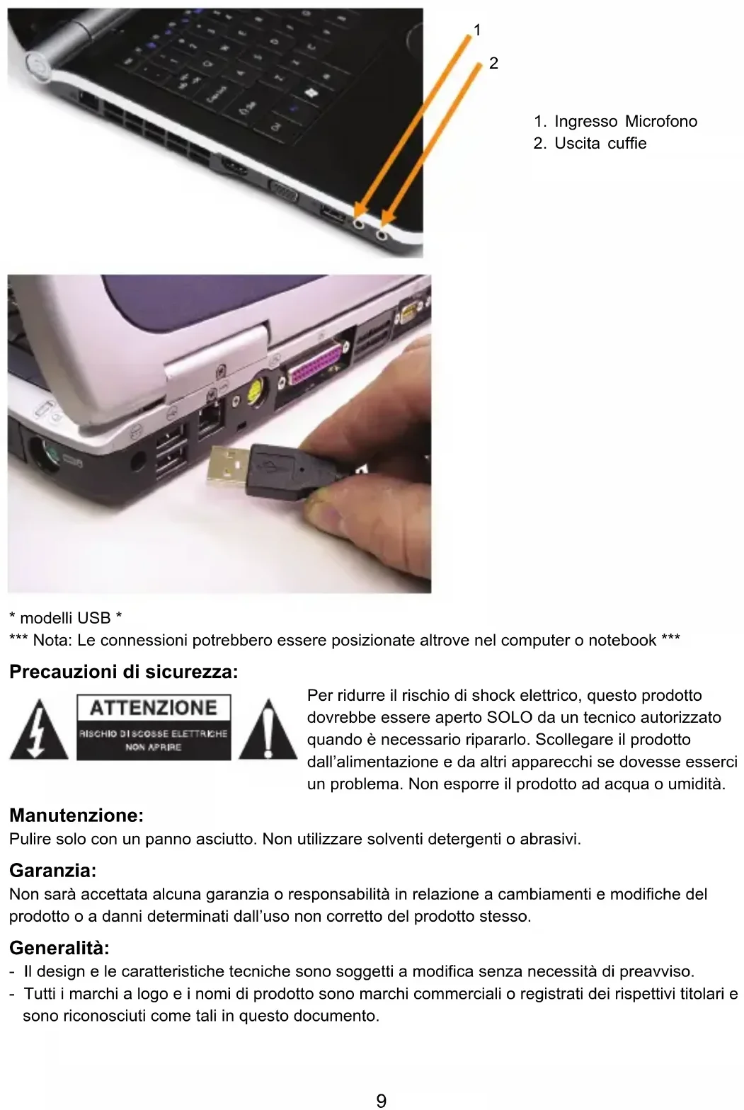 - modelli USB * *** Nota: Le connessioni potrebbero essere posizionate altrove nel computer o notebook *** Precauzioni di sicurezza: Per ridurre il rischio di shock elettrico, questo prodotto dovrebbe essere aperto SOLO da un tecnico autorizzato quando è necessario ripararlo. Scollegare il prodotto dall’alimentazione e da altri apparecchi se dovesse esserci un problema. Non esporre il prodotto ad acqua o umidità. Manutenzione: Pulire solo con un panno asciutto. Non utilizzare solventi detergenti o abrasivi. Garanzia: Non sarà accettata alcuna garanzia o responsabilità in relazione a cambiamenti e modifiche del prodotto o a danni determinati dall’uso non corretto del prodotto stesso. Generalità: - Il design e le caratteristiche tecniche sono soggetti a modifica senza necessità di preavviso. - Tutti i marchi a logo e i nomi di prodotto sono marchi commerciali o registrati dei rispettivi titolari e sono riconosciuti come tali in questo documento.