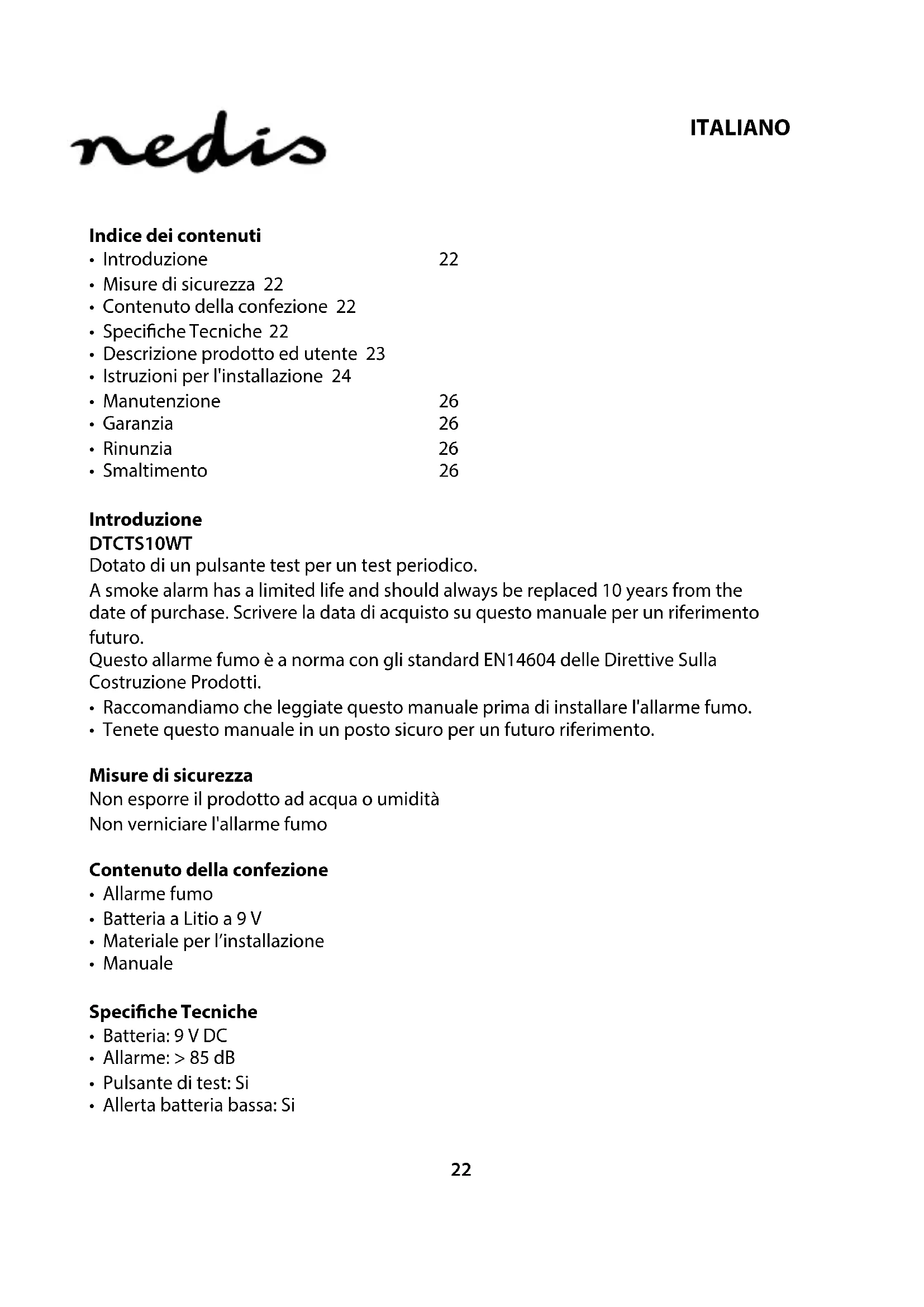 Scarica le istruzioni per il tuo Rilevatore di fumo in formato PDF gratuitamente! Trova il tuo manuale DTCTS10WT - NEDIS e riprendi in mano il tuo dispositivo elettronico. In questa pagina sono pubblicati tutti i documenti necessari per l'utilizzo del tuo dispositivo. DTCTS10WT del marchio NEDIS.