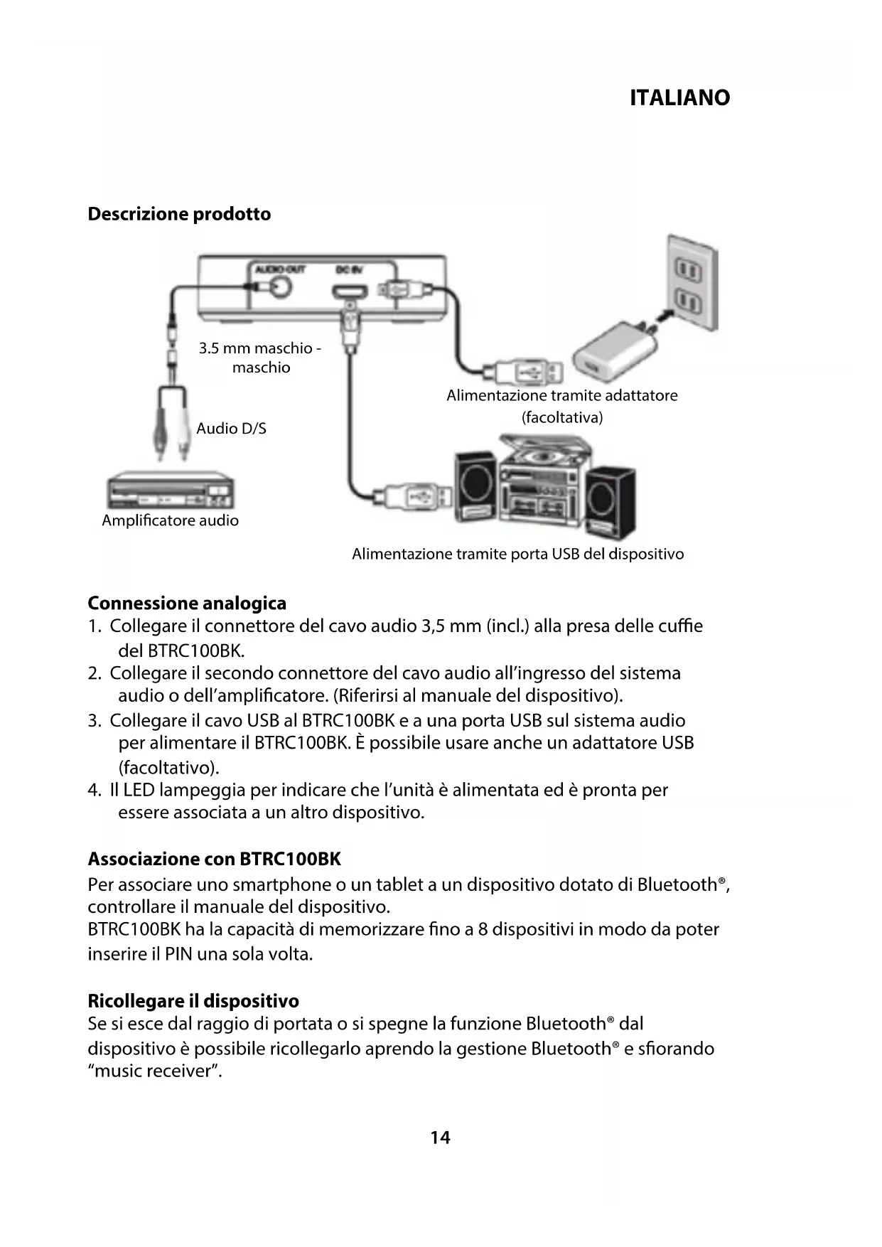 essere associata a un altro dispositivo. Associazione con BTRC100BK Per associare uno smartphone o un tablet a un dispositivo dotato di Bluetooth®, controllare il manuale del dispositivo. BTRC100BK ha la capacità di memorizzare no a 8 dispositivi in modo da poter inserire il PIN una sola volta. Ricollegare il dispositivo Se si esce dal raggio di portata o si spegne la funzione Bluetooth® dal dispositivo è possibile ricollegarlo aprendo la gestione Bluetooth® e sorando “music receiver”. ITALIANO15 Viene stabilita una connessione automatica se BTRC100BK è acceso. Se si desidera passare da un dispositivo all’altro, seguire le seguenti istruzioni: