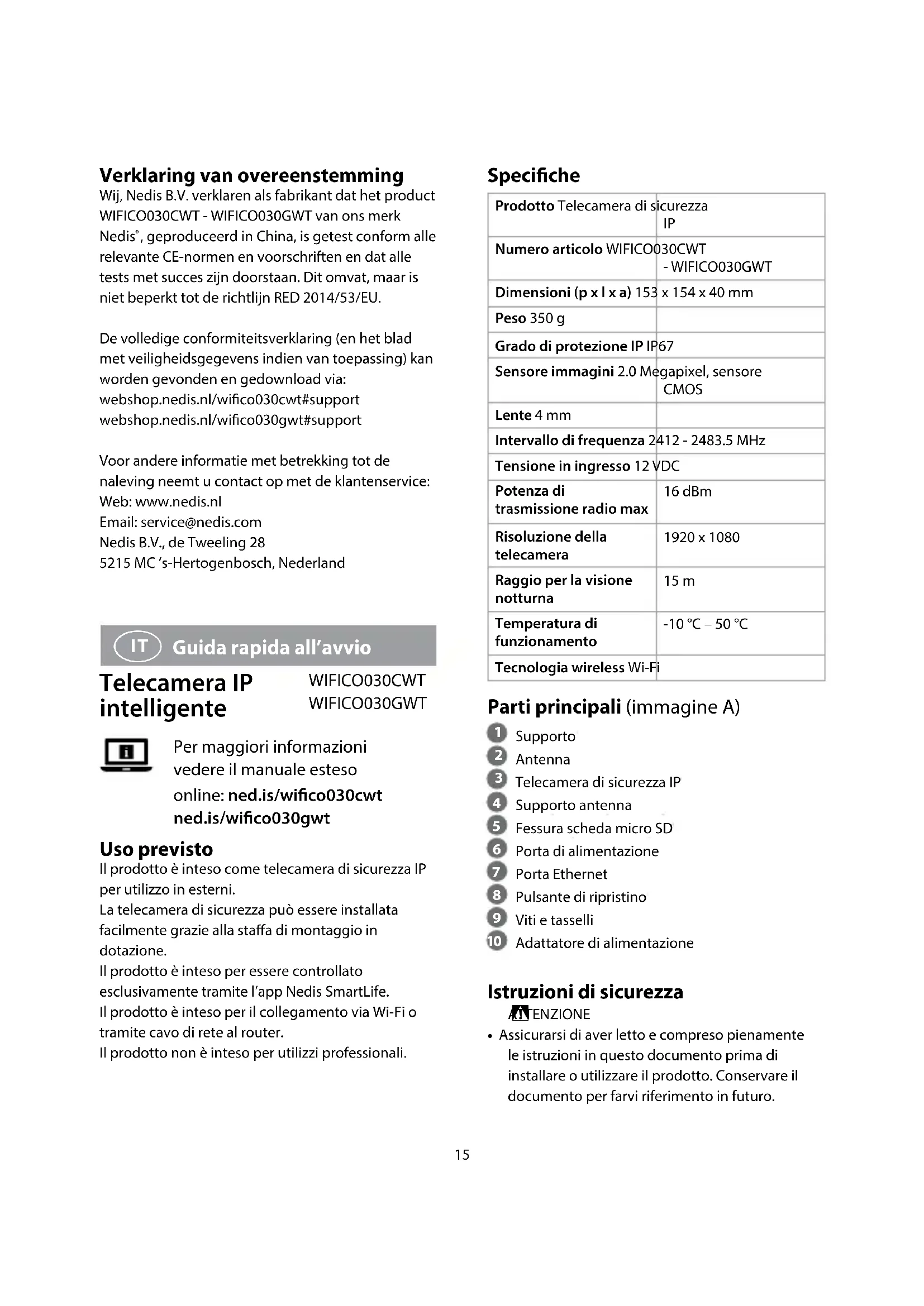 Guida rapida all’avvio Telecamera IP intelligente WIFICO030CWT WIFICO030GWT Per maggiori informazioni vedere il manuale esteso online: ned.is/wico030cwt ned.is/wico030gwt Uso previsto Il prodotto è inteso come telecamera di sicurezza IP per utilizzo in esterni.La telecamera di sicurezza può essere installata facilmente grazie alla staa di montaggio in dotazione.Il prodotto è inteso per essere controllato esclusivamente tramite l’app Nedis SmartLife.Il prodotto è inteso per il collegamento via Wi-Fi o tramite cavo di rete al router.Il prodotto non è inteso per utilizzi professionali.16