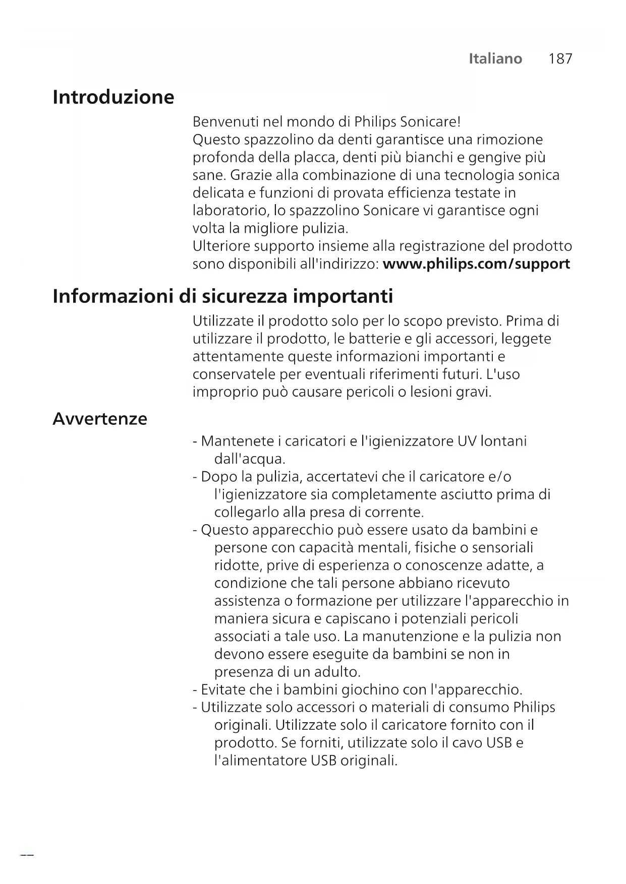 Italiano Introduzione Benvenuti nel mondo di Philips Sonicare! Questo spazzolino da denti garantisce una rimozione profonda della placca, denti più bianchi e gengive più sane. Grazie alla combinazione di una tecnologia sonica delicata e funzioni di provata efficienza testate in laboratorio, lo spazzolino Sonicare vi garantisce ogni volta la migliore pulizia. Ulteriore supporto insieme alla registrazione del prodotto sono disponibili all'indirizzo: www.philips.com/support Informazioni di sicurezza importanti Utilizzate il prodotto solo per lo scopo previsto. Prima di utilizzare il prodotto, le batterie e gli accessori, leggete attentamente queste informazioni importanti e conservatele per eventuali riferimenti futuri. L'uso improprio può causare pericoli o lesioni gravi. Avvertenze - Mantenete i caricatori e l'igienizzatore UV lontani dall'acqua. - Dopo la pulizia, accertatevi che il caricatore e/o l'igienizzatore sia completamente asciutto prima di collegarlo alla presa di corrente. - Questo apparecchio può essere usato da bambini e persone con capacità mentali, fisiche o sensoriali ridotte, prive di esperienza o conoscenze adatte, a condizione che tali persone abbiano ricevuto assistenza o formazione per utilizzare l'apparecchio in maniera sicura e capiscano i potenziali pericoli associati a tale uso. La manutenzione e la pulizia non devono essere eseguite da bambini se non in presenza di un adulto. - Evitate che i bambini giochino con l'apparecchio. - Utilizzate solo accessori o materiali di consumo Philips originali. Utilizzate solo il caricatore fornito con il prodotto. Se forniti, utilizzate solo il cavo USB e l'alimentatore USB originali.188 Italiano - Questo apparecchio non contiene parti riparabili dall'utente. Se l'apparecchio è danneggiato, smettete di utilizzarlo e contattate il Centro Assistenza Clienti del vostro Paese. Solo apparecchi con cavo: se il cavo è danneggiato, sostituite il caricatore con l'igienizzatore con uno nuovo. - Non utilizzate il caricabatterie e/o l'igienizzatore in esterni o in prossimità di superfici calde. - Non lavate i componenti del prodotto in lavastoviglie. - Questo apparecchio è destinato esclusivamente alla pulizia di denti, gengive e lingua. - Tenete sempre l'igienizzatore fuori dalla portata dei bambini. - Interrompete l'uso dell'igienizzatore se la lampadina a raggi UV rimane accesa nonostante lo sportello sia aperto. i raggi UV potrebbero essere nocivi per gli occhi e la pelle. - Utilizzate l'igienizzatore solo con lo schermo protettivo installato. - Non toccate la lampadina a raggi UV dell'igienizzatore UV se incandescente. - Non utilizzate l'apparecchio in presenza di setole rovinate o piegate. Sostituite la testina dello spazzolino ogni3 mesi o prima in presenza di segni di usura. - Evitate il contatto diretto con prodotti contenenti oli essenziali o olio di cocco. Potrebbe verificarsi il distacco delle setole. - Interrompete l'utilizzo dell'apparecchio e consultate il vostro dentista/medico in caso di eccessivo sanguinamento dopo l'uso, se il sanguinamento continua anche dopo 1 settimana di utilizzo o se avvertite fastidio o dolore. - Se nel corso degli ultimi 2 mesi vi siete sottoposti a interventi su denti o gengive, chiedete il parere del vostro dentista prima di utilizzare l'apparecchio. - I portatori di pacemaker o di altro dispositivo impiantato devono consultare il medico o il produttore del dispositivo impiantato prima dell'uso. - In caso di problemi orali, consultate il medico prima di utilizzare questo apparecchio.189 Italiano - Questo apparecchio è assolutamente personale e non deve essere utilizzato da più persone o presso studi dentistici. Istruzioni di sicurezza per le batterie - Questo apparecchio contiene batterie che possono essere sostituite solo da persone esperte. - Utilizzate il prodotto solo per lo scopo previsto. Prima di utilizzare il prodotto, le batterie e gli accessori, leggete attentamente queste informazioni e conservatele per eventuali riferimenti futuri. L'uso improprio può causare pericoli o lesioni gravi. Gli accessori forniti potrebbero variare a seconda del prodotto. - Utilizzate solo accessori e materiali di consumo Philips originali. Utilizzate solo l'alimentatore rimovibile TCBxxxx, HX6100, HX6110, HX6160 o WAAxxxx. - Tenete il prodotto e le batterie lontani dal fuoco e non esponeteli alla luce solare diretta o alle alte temperature. - Se il prodotto si surriscalda in modo anomalo, emana un odore strano, cambia colore o se la ricarica richiede più tempo del solito, interrompete l'utilizzo e la ricarica del prodotto e contattate Philips. - Non collocate i prodotti e le relative batterie in forni a microonde o su fornelli a induzione. - Per evitare che le batterie si surriscaldino o rilascino sostanze tossiche o pericolose, non aprite, modificate, perforate, danneggiate o smontate il prodotto o le batterie. Non mandate in cortocircuito, sovraccaricate o invertite la polarità delle batterie. - Questo apparecchio contiene batterie non sostituibili. Smaltite in modo adeguato l'apparecchio quando la batteria è esaurita. Consultate la sezione sul riciclo. - Se le batterie sono danneggiate o perdono del liquido, evitate il contatto con la pelle o gli occhi. In tal caso, sciacquate subito e accuratamente con acqua e consultate un medico. - Quando maneggiate le batterie, assicuratevi che le mani, il prodotto e le batterie siano asciutti.190 Italiano - Per evitare il cortocircuito accidentale delle batterie dopo la rimozione, evitate che i terminali delle batterie entrino in contatto con oggetti metallici, come monete, forcine o anelli. Non avvolgete le batterie in una pellicola di alluminio. Coprite i terminali delle batterie o riponete le batterie in un sacchetto di plastica prima di smaltirle. - Ricaricate e utilizzate il prodotto a una temperatura compresa tra 0 °C e 40 °C. Condizioni di stoccaggio e trasporto Temperatura da -10°C a 60°C. Campi elettromagnetici (EMF) Questo apparecchio P