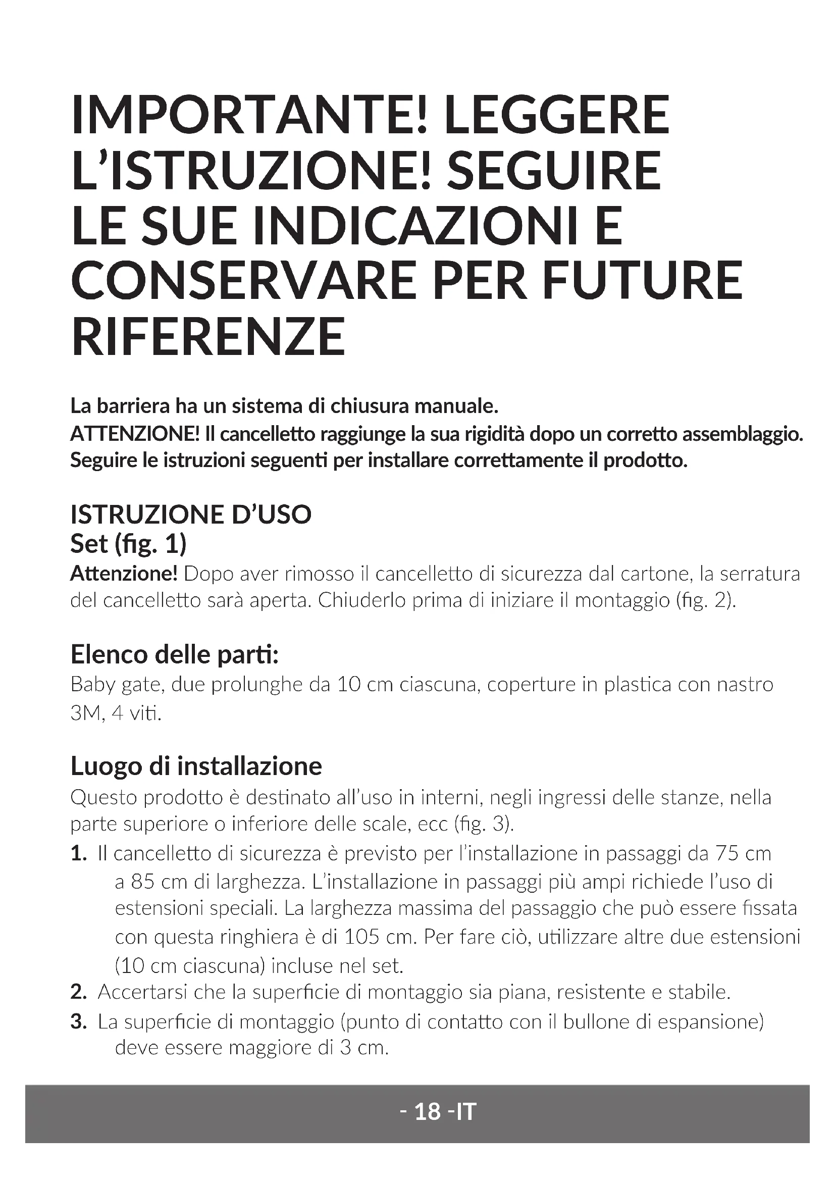 Set (g. 1) Aenzione! Dopo aver rimosso il cancelleo di sicurezza dal cartone, la serratura del cancelleo sarà aperta. Chiuderlo prima di iniziare il montaggio (g. 2). Elenco delle par: Baby gate, due prolunghe da 10 cm ciascuna, coperture in plasca con nastro 3M, 4 vi. Luogo di installazione Questo prodoo è desnato all’uso in interni, negli ingressi delle stanze, nella parte superiore o inferiore delle scale, ecc (g. 3).