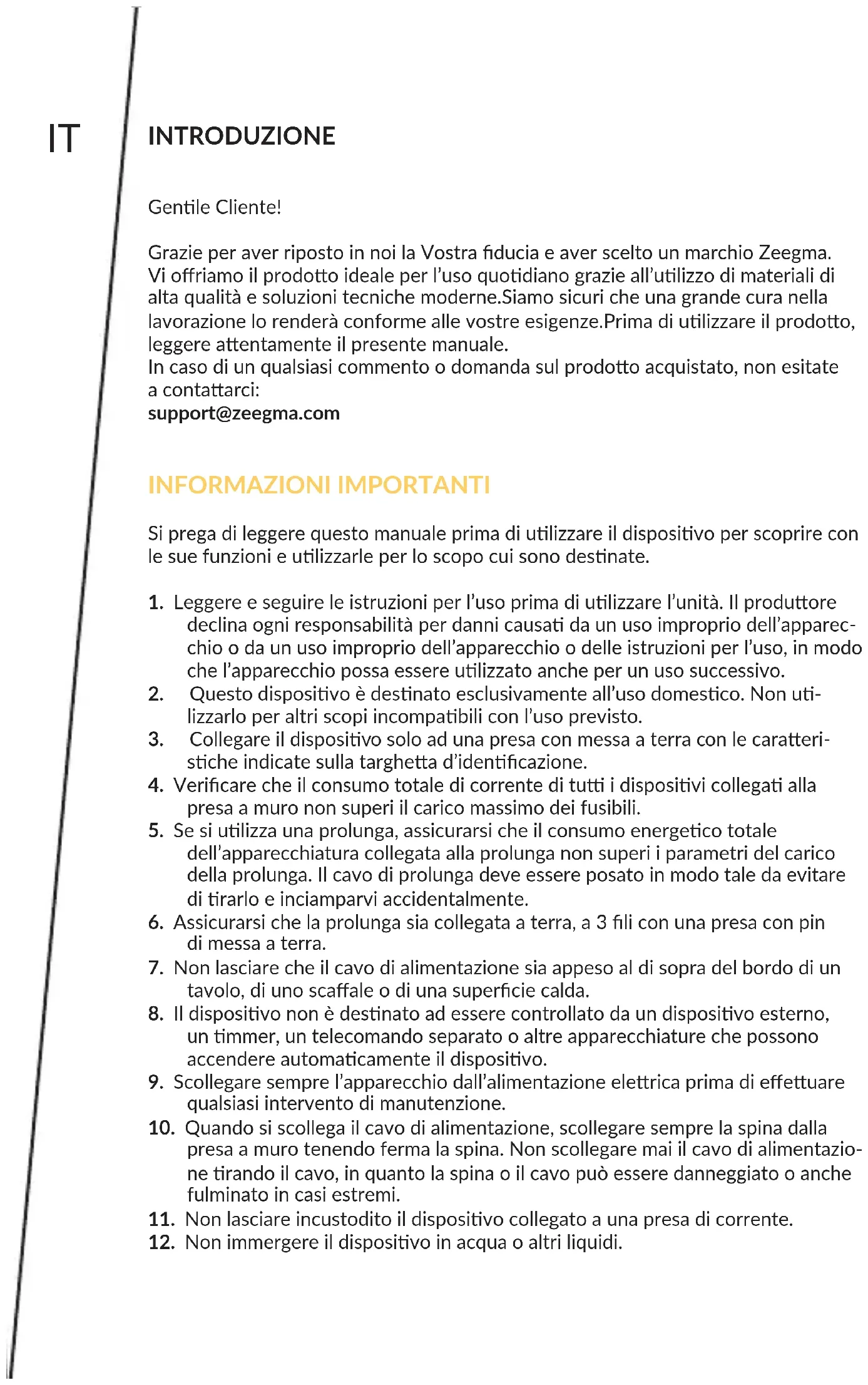 Zdjęcia mają charakter poglądowy, rzeczywisty wygląd produktów może różnić się od prezentowanego na zdjęciach.IT INTRODUZIONE Genle Cliente! Grazie per aver riposto in noi la Vostra ducia e aver scelto un marchio Zeegma. Vi oriamo il prodoo ideale per l’uso quodiano grazie all’ulizzo di materiali di alta qualità e soluzioni tecniche moderne.Siamo sicuri che una grande cura nella lavorazione lo renderà conforme alle vostre esigenze.Prima di ulizzare il prodoo, leggere aentamente il presente manuale. In caso di un qualsiasi commento o domanda sul prodoo acquistato, non esitate a contaarci: support@zeegma.com INFORMAZIONI IMPORTANTI Si prega di leggere questo manuale prima di ulizzare il disposivo per scoprire con le sue funzioni e ulizzarle per lo scopo cui sono desnate.