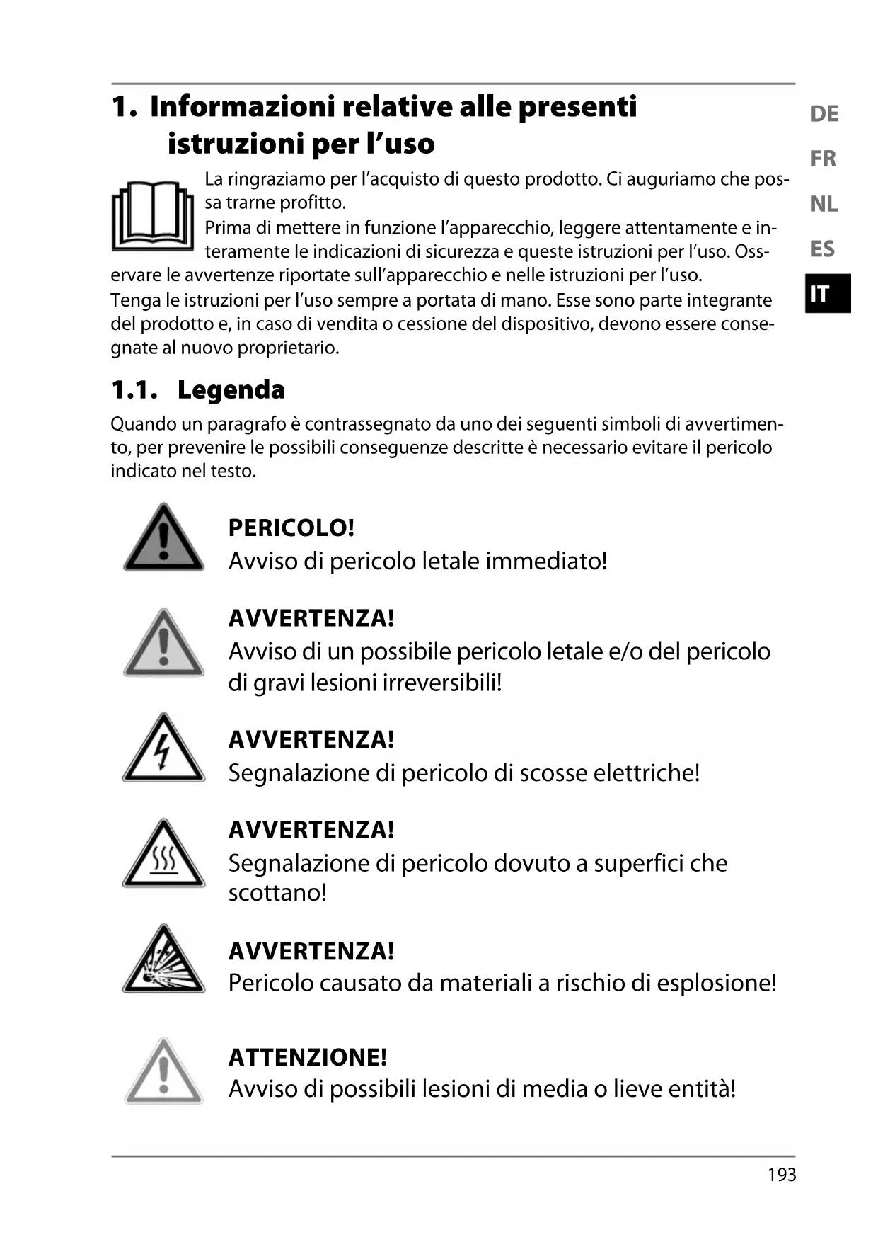 istruzioni per l’uso La ringraziamo per l’acquisto di questo prodotto. Ci auguriamo che pos- sa trarne profitto. Prima di mettere in funzione l’apparecchio, leggere attentamente e in- teramente le indicazioni di sicurezza e queste istruzioni per l’uso. Oss- ervare le avvertenze riportate sull’apparecchio e nelle istruzioni per l’uso. Tenga le istruzioni per l’uso sempre a portata di mano. Esse sono parte integrante del prodotto e, in caso di vendita o cessione del dispositivo, devono essere conse- gnate al nuovo proprietario. 1.1. Legenda Quando un paragrafo è contrassegnato da uno dei seguenti simboli di avvertimen- to, per prevenire le possibili conseguenze descritte è necessario evitare il pericolo indicato nel testo. PERICOLO! Avviso di pericolo letale immediato! AVVERTENZA! Avviso di un possibile pericolo letale e/o del pericolo di gravi lesioni irreversibili! AVVERTENZA! Segnalazione di pericolo di scosse elettriche! AVVERTENZA! Segnalazione di pericolo dovuto a superfici che scottano! AVVERTENZA! Pericolo causato da materiali a rischio di esplosione! ATTENZIONE! Avviso di possibili lesioni di media o lieve entità!194 AVVISO! Seguire le indicazioni al fine di evitare danni alle cose! Segnalazione di ulteriori informazioni sull'utilizzo del dispositivo. Osservare le indicazioni contenute nelle istruzioni per l’uso!