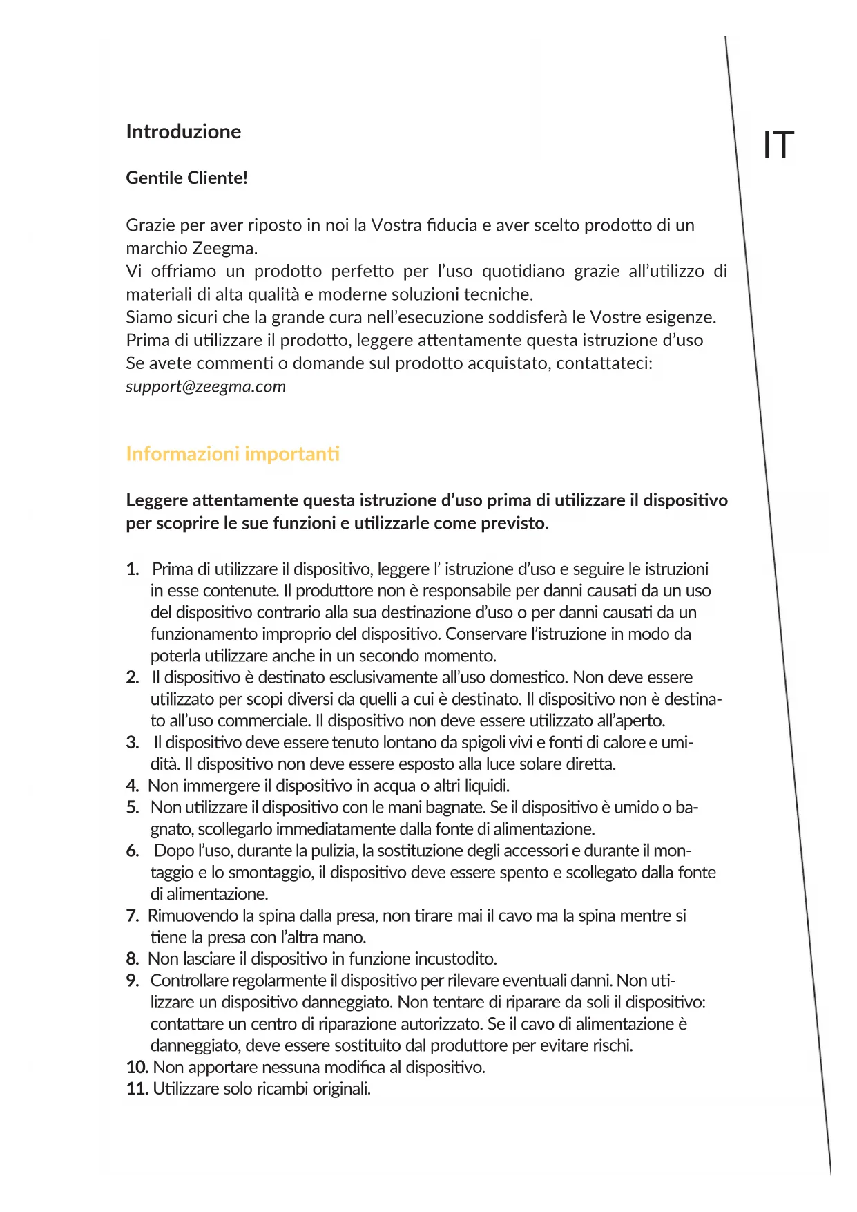 Zdjęcia mają charakter poglądowy, rzeczywisty wygląd produktów może różnić się od prezentowanego na zdjęciach.IT Introduzione Genle Cliente! Grazie per aver riposto in noi la Vostra ducia e aver scelto prodoo di un marchio Zeegma. Vi oriamo un prodoo perfeo per l’uso quodiano grazie all’ulizzo di materiali di alta qualità e moderne soluzioni tecniche. Siamo sicuri che la grande cura nell’esecuzione soddisferà le Vostre esigenze. Prima di ulizzare il prodoo, leggere aentamente questa istruzione d’uso Se avete commen o domande sul prodoo acquistato, contaateci: support@zeegma.com Informazioni importan Leggere aentamente questa istruzione d’uso prima di ulizzare il disposivo per scoprire le sue funzioni e ulizzarle come previsto.