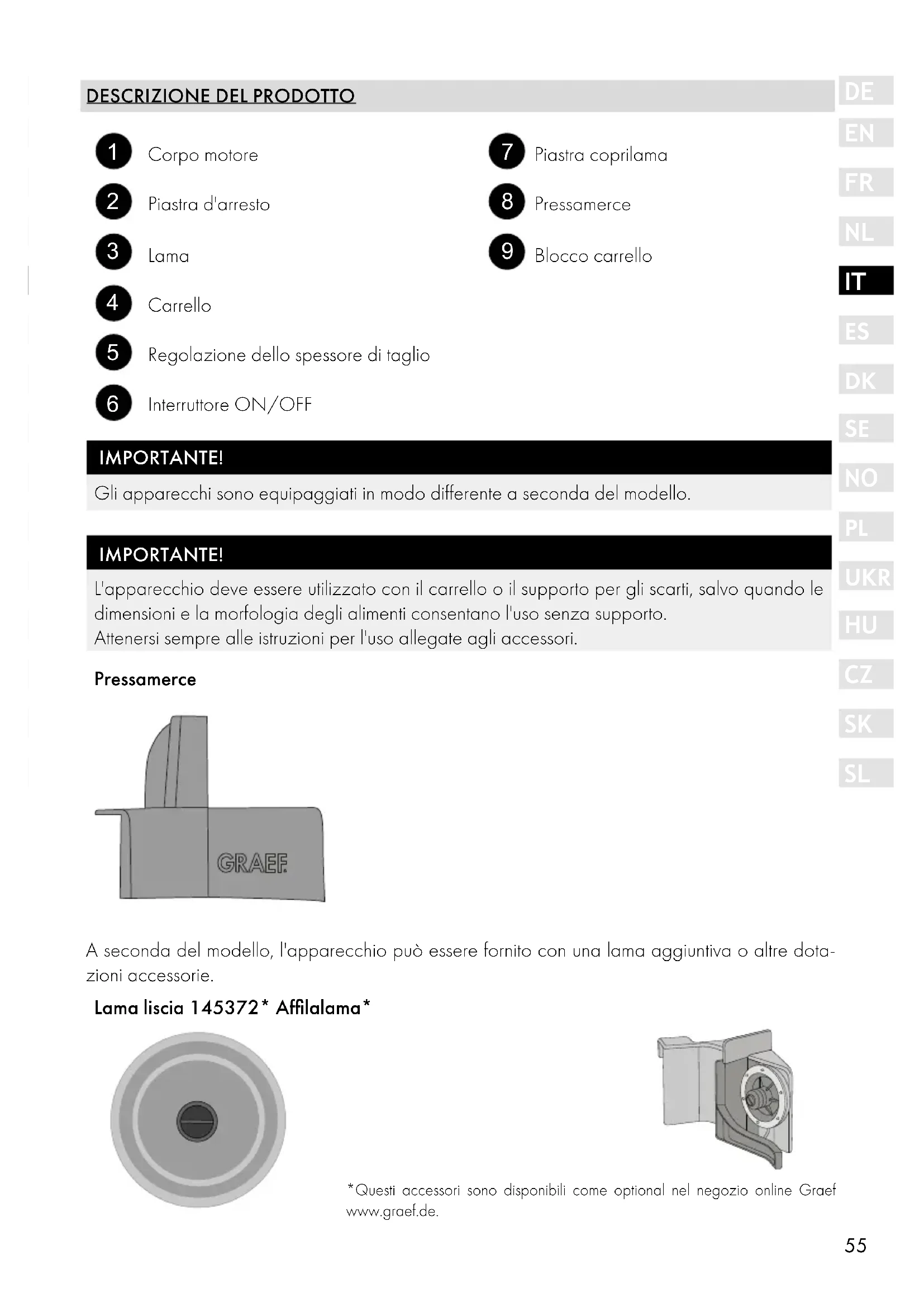 Interruttore ON/OFF IMPORTANTE! Gli apparecchi sono equipaggiati in modo differente a seconda del modello. IMPORTANTE! L'apparecchio deve essere utilizzato con il carrello o il supporto per gli scarti, salvo quando le dimensioni e la morfologia degli alimenti consentano l'uso senza supporto. Attenersi sempre alle istruzioni per l'uso allegate agli accessori. Pressamerce A seconda del modello, l'apparecchio può essere fornito con una lama aggiuntiva o altre dota- zioni accessorie. Lama liscia 145372* Affilalama* *Questi accessori sono disponibili come optional nel negozio online Graef www.graef.de.56 PREFAZIONE Gentile Cliente, con l'acquisto di questa affettatrice universale ha fatto una buona scelta. Ha acquistato un prodotto di qualità comprovata. Vi ringraziamo per l’acquisto e vi auguriamo un uso soddisfacente della vostra affettatrice univer- sale Graef. INFORMAZIONI RELATIVE ALLE PRESENTI ISTRUZIONI PER L'USO Le presenti istruzioni d'uso sono parte integrante dell’affettatrice universale (in seguito denominata dispositivo) e forniscono informazioni di fondamentale importanza per l'effettiva messa in funzione, la sicurezza e l'utilizzo corretto in linea con le finalità previste, oltre alle indicazioni relative alla manutenzione e alla cura del dispositivo stesso. Le istruzioni per l'uso devono essere sempre disponibili presso il dispositivo. Devono essere lette e applicate da chiunque sia incarico della: ● messa in servizio, ● gestione, ● Risoluzione di disfunzioni e/o la ● Pulizia
