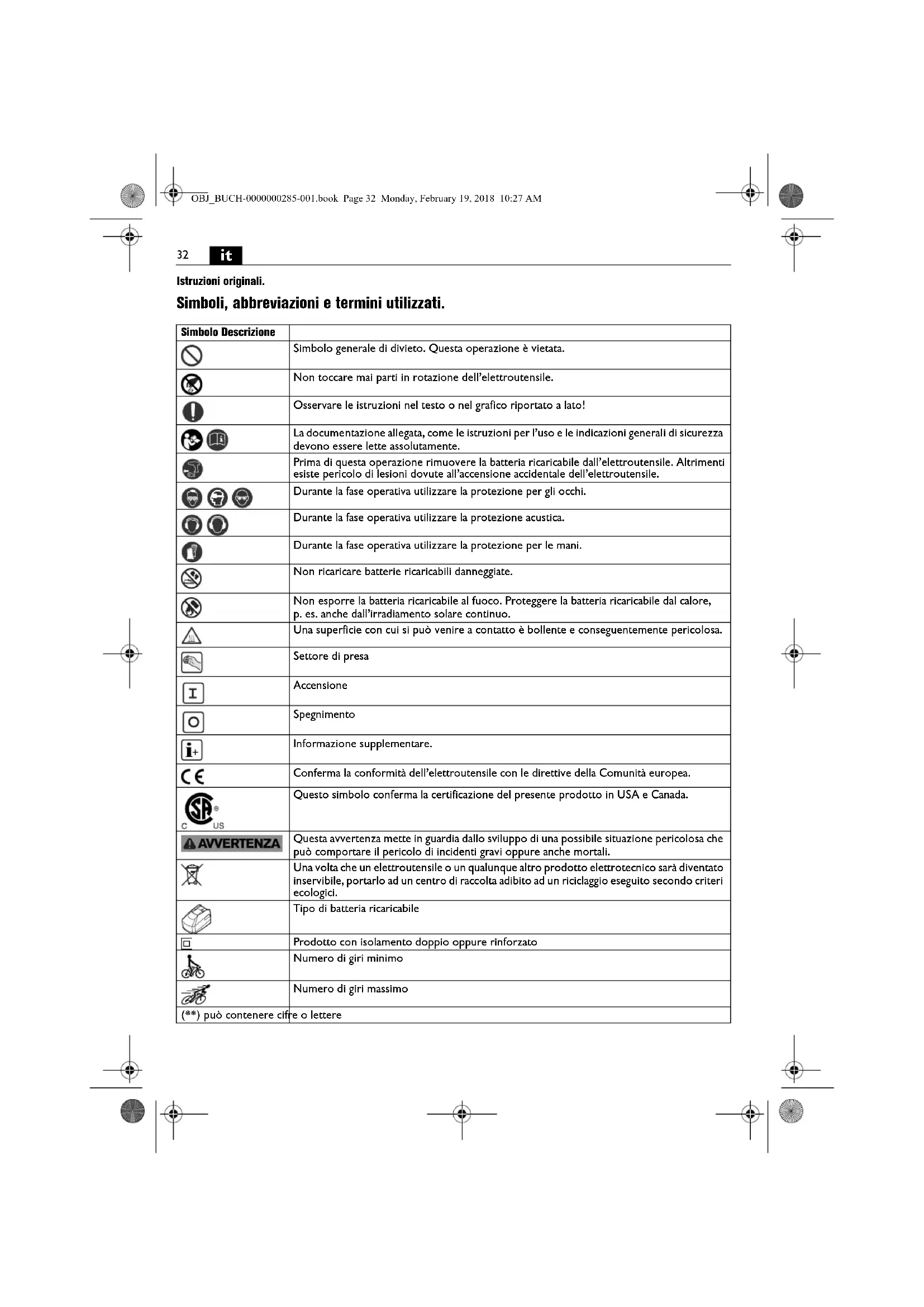 Istruzioni originali. Simboli, abbreviazioni e termini utilizzati. Simbolo Descrizione Simbolo generale di divieto. Questa operazione è vietata. Non toccare mai parti in rotazione dell’elettroutensile. Osservare le istruzioni nel testo o nel grafico riportato a lato! La documentazione allegata, come le istruzioni per l’uso e le indicazioni generali di sicurezza devono essere lette assolutamente. Prima di questa operazione rimuovere la batteria ricaricabile dall’elettroutensile. Altrimenti esiste pericolo di lesioni dovute all’accensione accidentale dell’elettroutensile. Durante la fase operativa utilizzare la protezione per gli occhi. Durante la fase operativa utilizzare la protezione acustica. Durante la fase operativa utilizzare la protezione per le mani. Non ricaricare batterie ricaricabili danneggiate. Non esporre la batteria ricaricabile al fuoco. Proteggere la batteria ricaricabile dal calore, p. es. anche dall’irradiamento solare continuo. Una superficie con cui si può venire a contatto è bollente e conseguentemente pericolosa. Settore di presa Accensione Spegnimento Informazione supplementare. Conferma la conformità dell’elettroutensile con le direttive della Comunità europea. Questo simbolo conferma la certificazione del presente prodotto in USA e Canada. Questa avvertenza mette in guardia dallo sviluppo di una possibile situazione pericolosa che può comportare il pericolo di incidenti gravi oppure anche mortali. Una volta che un elettroutensile o un qualunque altro prodotto elettrotecnico sarà diventato inservibile, portarlo ad un centro di raccolta adibito ad un riciclaggio eseguito secondo criteri ecologici. Tipo di batteria ricaricabile Prodotto con isolamento doppio oppure rinforzato Numero di giri minimo Numero di giri massimo (**) può contenere cifre o lettere OBJ_BUCH-0000000285-001.book Page 32 Monday, February 19, 2018 10:27 AM33