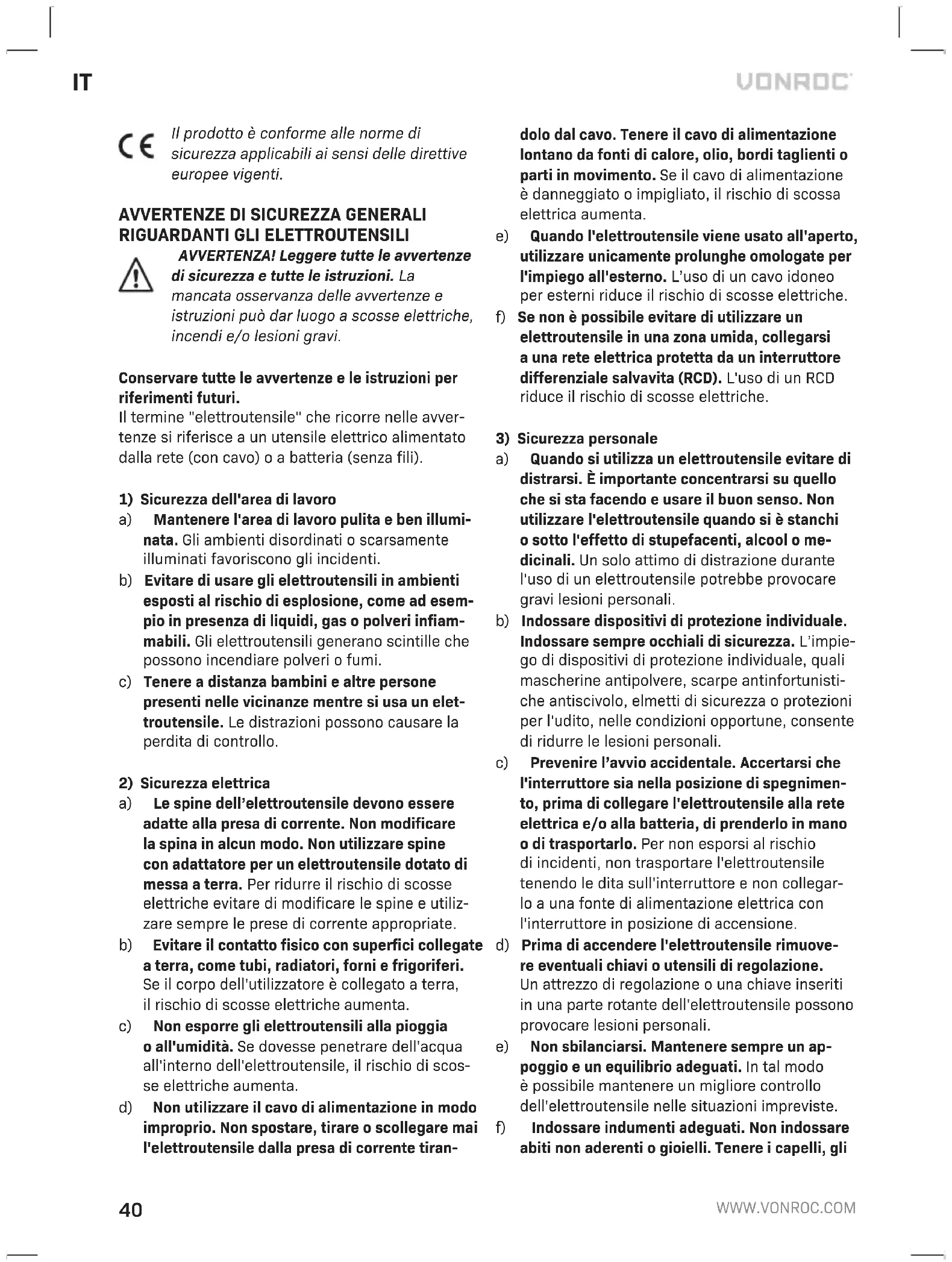 ammoniaca, ecc. Le sostanze chimiche di questo tipo danneggiano i componenti sintetici. PROTEZIONE DELL'AMBIENTE Le apparecchiature elettriche o elettroniche difettose e/o scartate devono essere conferi- te presso gli opportuni siti di riciclaggio. Solo per i Paesi UE Non smaltire gli elettroutensili insieme ai rifiuti domestici. Secondo la Direttiva europea 2012/19/ UE sui rifiuti delle apparecchiature elettriche ed elettroniche e la relativa implementazione nelle normative locali, gli elettroutensili ormai inutilizza- bili devono essere raccolti separatamente e smaltiti nel rispetto dell'ambiente. GARANZIA I prodotti VONROC sono sviluppati secondo gli stan- dard di qualità più elevati e sono garantiti esenti da difetti, sia per quanto riguarda i materiali che la lavorazione, per il periodo stabilito per legge a decorrere dalla data di acquisto iniziale. Se durante questo periodo il prodotto dovesse presentare dei difetti di materiali e/o di lavorazione, contattare direttamente VONROC. Le seguenti circostanze sono escluse dalla garanzia: