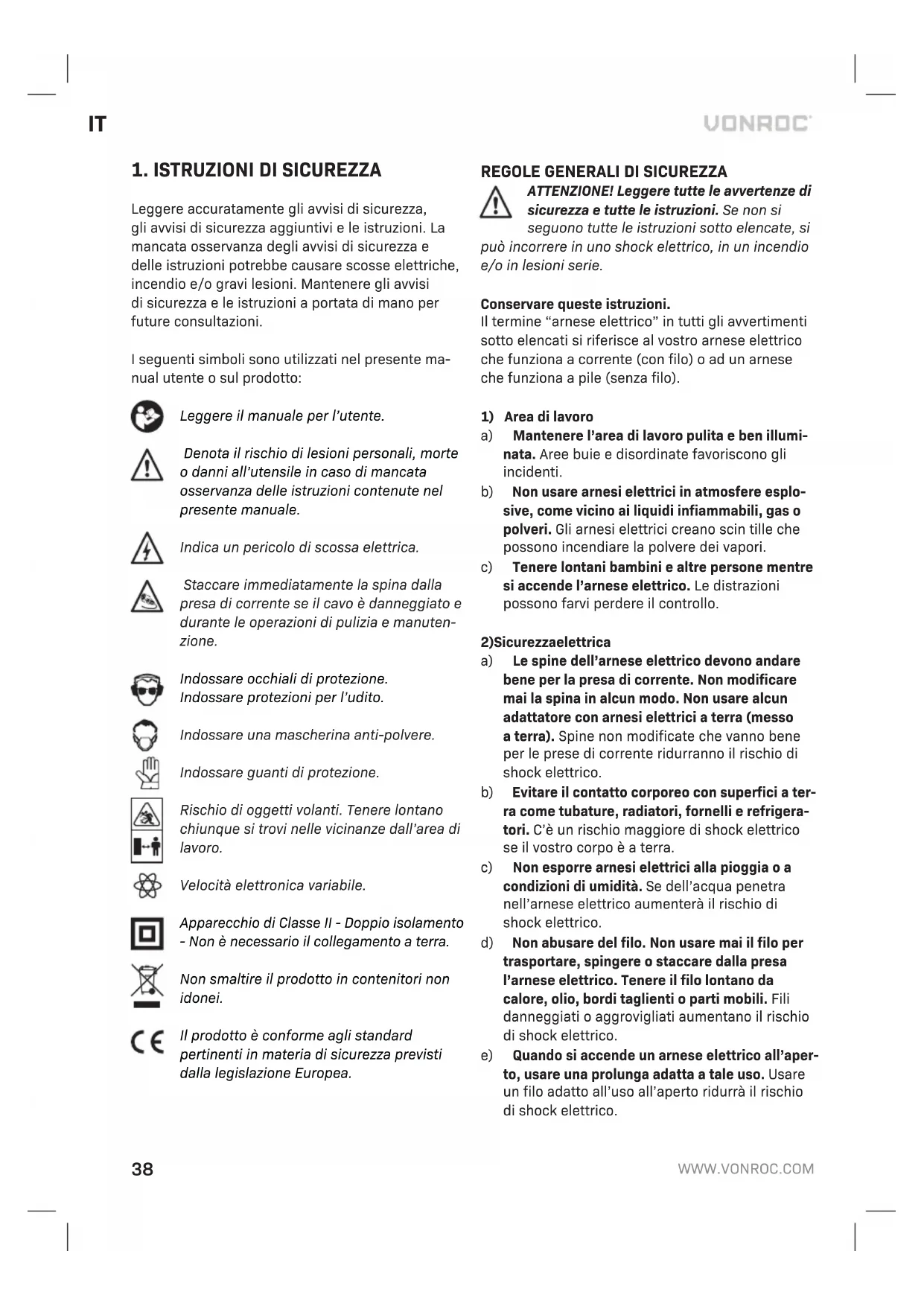 Leggere accuratamente gli avvisi di sicurezza, gli avvisi di sicurezza aggiuntivi e le istruzioni. La mancata osservanza degli avvisi di sicurezza e delle istruzioni potrebbe causare scosse elettriche, incendio e/o gravi lesioni. Mantenere gli avvisi di sicurezza e le istruzioni a portata di mano per future consultazioni. I seguenti simboli sono utilizzati nel presente ma- nual utente o sul prodotto: Leggere il manuale per l’utente. Denota il rischio di lesioni personali, morte o danni all’utensile in caso di mancata osservanza delle istruzioni contenute nel presente manuale. Indica un pericolo di scossa elettrica. Staccare immediatamente la spina dalla presa di corrente se il cavo è danneggiato e durante le operazioni di pulizia e manuten- zione. Indossare occhiali di protezione. Indossare protezioni per l’udito. Indossare una mascherina anti-polvere. Indossare guanti di protezione. Rischio di oggetti volanti. Tenere lontano chiunque si trovi nelle vicinanze dall’area di lavoro. Velocità elettronica variabile. Apparecchio di Classe II - Doppio isolamento - Non è necessario il collegamento a terra. Non smaltire il prodotto in contenitori non idonei. Il prodotto è conforme agli standard pertinenti in materia di sicurezza previsti dalla legislazione Europea.