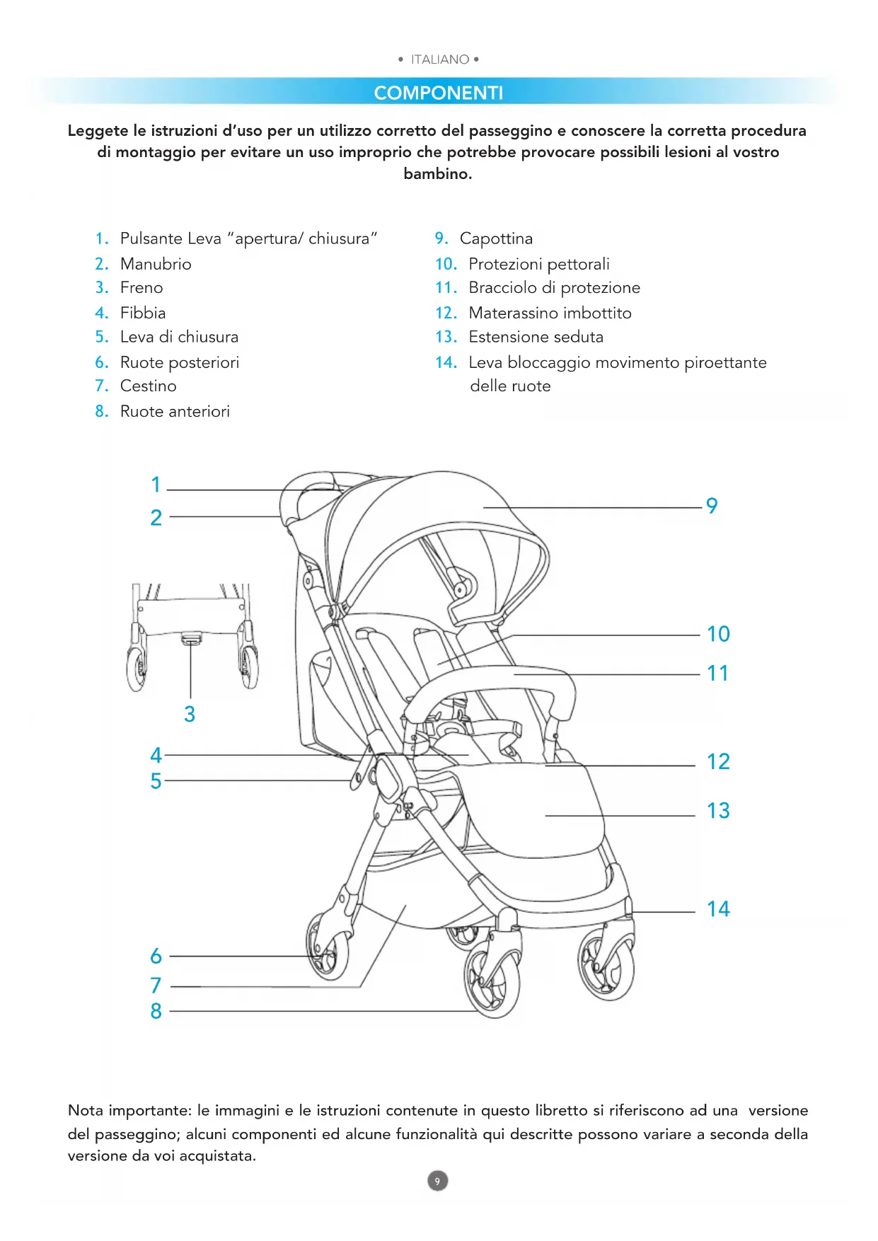 delle ruote Nota importante: le immagini e le istruzioni contenute in questo libretto si riferiscono ad una versione del passeggino; alcuni componenti ed alcune funzionalità qui descritte possono variare a seconda della versione da voi acquistata. Leggete le istruzioni d’uso per un utilizzo corretto del passeggino e conoscere la corretta procedura di montaggio per evitare un uso improprio che potrebbe provocare possibili lesioni al vostro bambino.