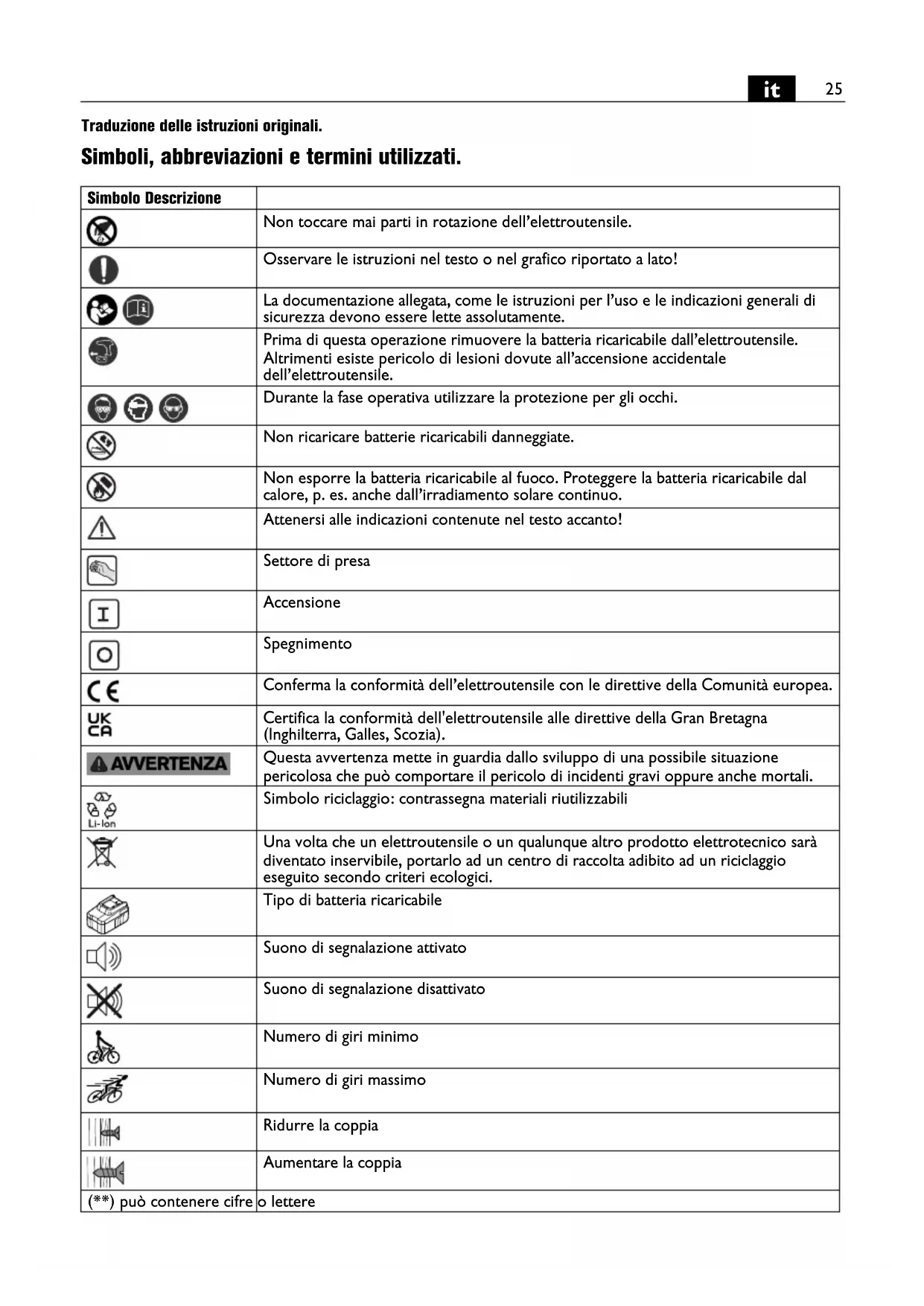 Traduzione delle istruzioni originali. Simboli, abbreviazioni e termini utilizzati. Simbolo Descrizione Non toccare mai parti in rotazione dell’elettroutensile. Osservare le istruzioni nel testo o nel grafico riportato a lato! La documentazione allegata, come le istruzioni per l’uso e le indicazioni generali di sicurezza devono essere lette assolutamente. Prima di questa operazione rimuovere la batteria ricaricabile dall’elettroutensile. Altrimenti esiste pericolo di lesioni dovute all’accensione accidentale dell’elettroutensile. Durante la fase operativa utilizzare la protezione per gli occhi. Non ricaricare batterie ricaricabili danneggiate. Non esporre la batteria ricaricabile al fuoco. Proteggere la batteria ricaricabile dal calore, p. es. anche dall’irradiamento solare continuo. Attenersi alle indicazioni contenute nel testo accanto! Settore di presa Accensione Spegnimento Conferma la conformità dell’elettroutensile con le direttive della Comunità europea. Certifica la conformità dell'elettroutensile alle direttive della Gran Bretagna (Inghilterra, Galles, Scozia). Questa avvertenza mette in guardia dallo sviluppo di una possibile situazione pericolosa che può comportare il pericolo di incidenti gravi oppure anche mortali. Simbolo riciclaggio: contrassegna materiali riutilizzabili Una volta che un elettroutensile o un qualunque altro prodotto elettrotecnico sarà diventato inservibile, portarlo ad un centro di raccolta adibito ad un riciclaggio eseguito secondo criteri ecologici. Tipo di batteria ricaricabile Suono di segnalazione attivato Suono di segnalazione disattivato Numero di giri minimo Numero di giri massimo Ridurre la coppia Aumentare la coppia (**) può contenere cifre o lettere26