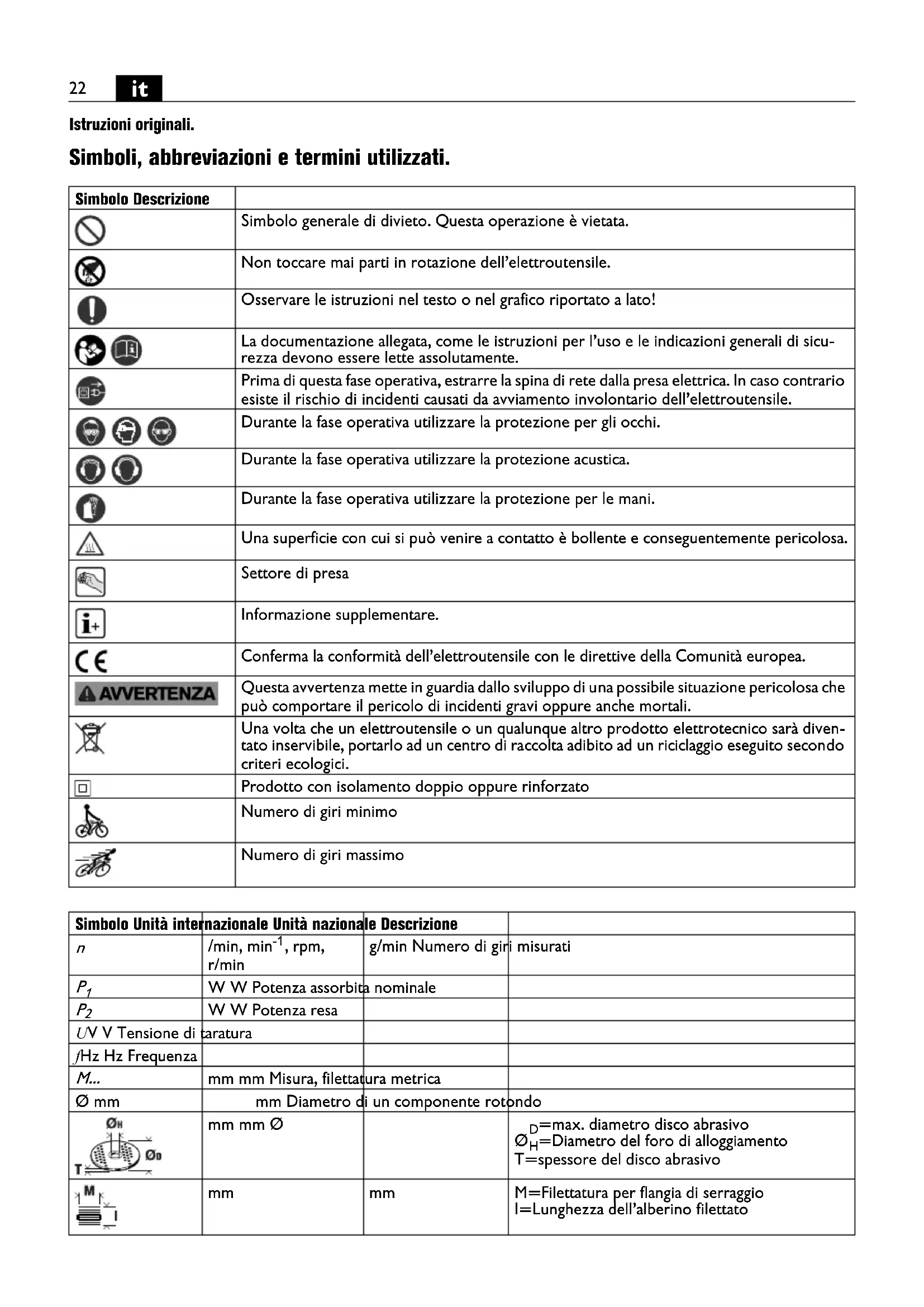 Istruzioni originali. Simboli, abbreviazioni e termini utilizzati. Simbolo Descrizione Simbolo generale di divieto. Questa operazione è vietata. Non toccare mai parti in rotazione dell’elettroutensile. Osservare le istruzioni nel testo o nel grafico riportato a lato! La documentazione allegata, come le istruzioni per l’uso e le indicazioni generali di sicu- rezza devono essere lette assolutamente. Prima di questa fase operativa, estrarre la spina di rete dalla presa elettrica. In caso contrario esiste il rischio di incidenti causati da avviamento involontario dell’elettroutensile. Durante la fase operativa utilizzare la protezione per gli occhi. Durante la fase operativa utilizzare la protezione acustica. Durante la fase operativa utilizzare la protezione per le mani. Una superficie con cui si può venire a contatto è bollente e conseguentemente pericolosa. Settore di presa Informazione supplementare. Conferma la conformità dell’elettroutensile con le direttive della Comunità europea. Questa avvertenza mette in guardia dallo sviluppo di una possibile situazione pericolosa che può comportare il pericolo di incidenti gravi oppure anche mortali. Una volta che un elettroutensile o un qualunque altro prodotto elettrotecnico sarà diven- tato inservibile, portarlo ad un centro di raccolta adibito ad un riciclaggio eseguito secondo criteri ecologici. Prodotto con isolamento doppio oppure rinforzato Numero di giri minimo Numero di giri massimo Simbolo Unità internazionale Unità nazionale Descrizione