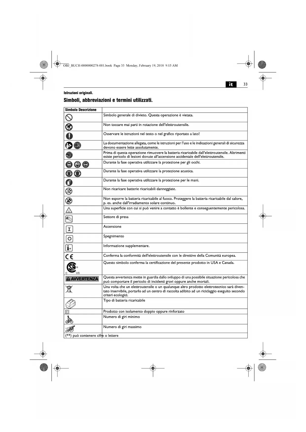 Istruzioni originali. Simboli, abbreviazioni e termini utilizzati. Simbolo Descrizione Simbolo generale di divieto. Questa operazione è vietata. Non toccare mai parti in rotazione dell’elettroutensile. Osservare le istruzioni nel testo o nel grafico riportato a lato! La documentazione allegata, come le istruzioni per l’uso e le indicazioni generali di sicurezza devono essere lette assolutamente. Prima di questa operazione rimuovere la batteria ricaricabile dall’elettroutensile. Altrimenti esiste pericolo di lesioni dovute all’accensione accidentale dell’elettroutensile. Durante la fase operativa utilizzare la protezione per gli occhi. Durante la fase operativa utilizzare la protezione acustica. Durante la fase operativa utilizzare la protezione per le mani. Non ricaricare batterie ricaricabili danneggiate. Non esporre la batteria ricaricabile al fuoco. Proteggere la batteria ricaricabile dal calore, p. es. anche dall’irradiamento solare continuo. Una superficie con cui si può venire a contatto è bollente e conseguentemente pericolosa. Settore di presa Accensione Spegnimento Informazione supplementare. Conferma la conformità dell’elettroutensile con le direttive della Comunità europea. Questo simbolo conferma la certificazione del presente prodotto in USA e Canada. Questa avvertenza mette in guardia dallo sviluppo di una possibile situazione pericolosa che può comportare il pericolo di incidenti gravi oppure anche mortali. Una volta che un elettroutensile o un qualunque altro prodotto elettrotecnico sarà diven- tato inservibile, portarlo ad un centro di raccolta adibito ad un riciclaggio eseguito secondo criteri ecologici. Tipo di batteria ricaricabile Prodotto con isolamento doppio oppure rinforzato Numero di giri minimo Numero di giri massimo (**) può contenere cifre o lettere OBJ_BUCH-0000000278-001.book Page 33 Monday, February 19, 2018 9:15 AM34