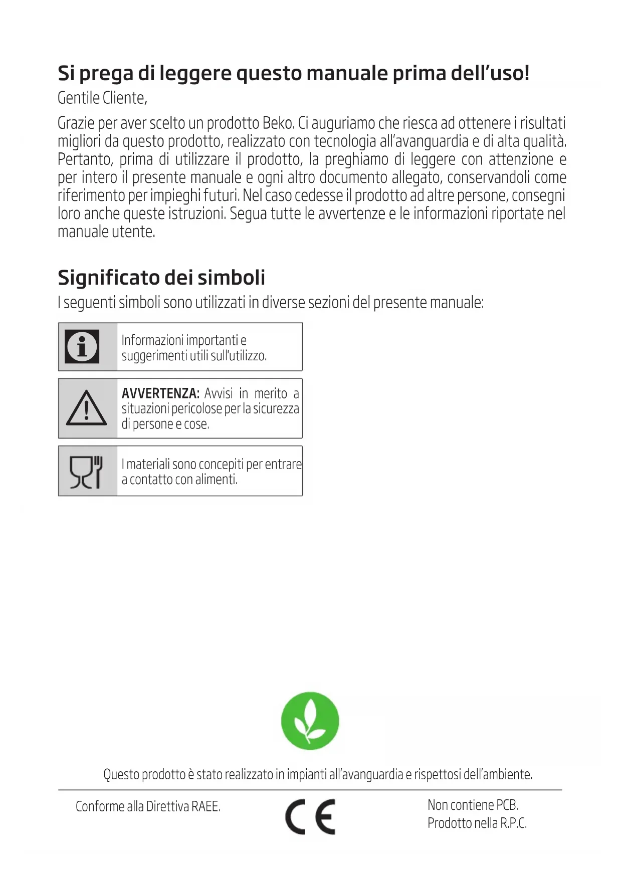 AVVERTENZA: Avvisi in merito a situazioni pericolose per la sicurezza di persone e cose. I materiali sono concepiti per entrare a contatto con alimenti. Questo prodotto è stato realizzato in impianti all’avanguardia e rispettosi dell’ambiente. Conforme alla Direttiva RAEE. Non contiene PCB. Prodotto nella R.P.C.88 / IT Macchina da Caffè / Manuale Utente Questa sezione contiene istruzioni di sicurezza che consentono di prevenire il pericolo di lesioni personali o di danni materiali. L’inosservanza di queste istruzioni invalida la garanzia accordata.