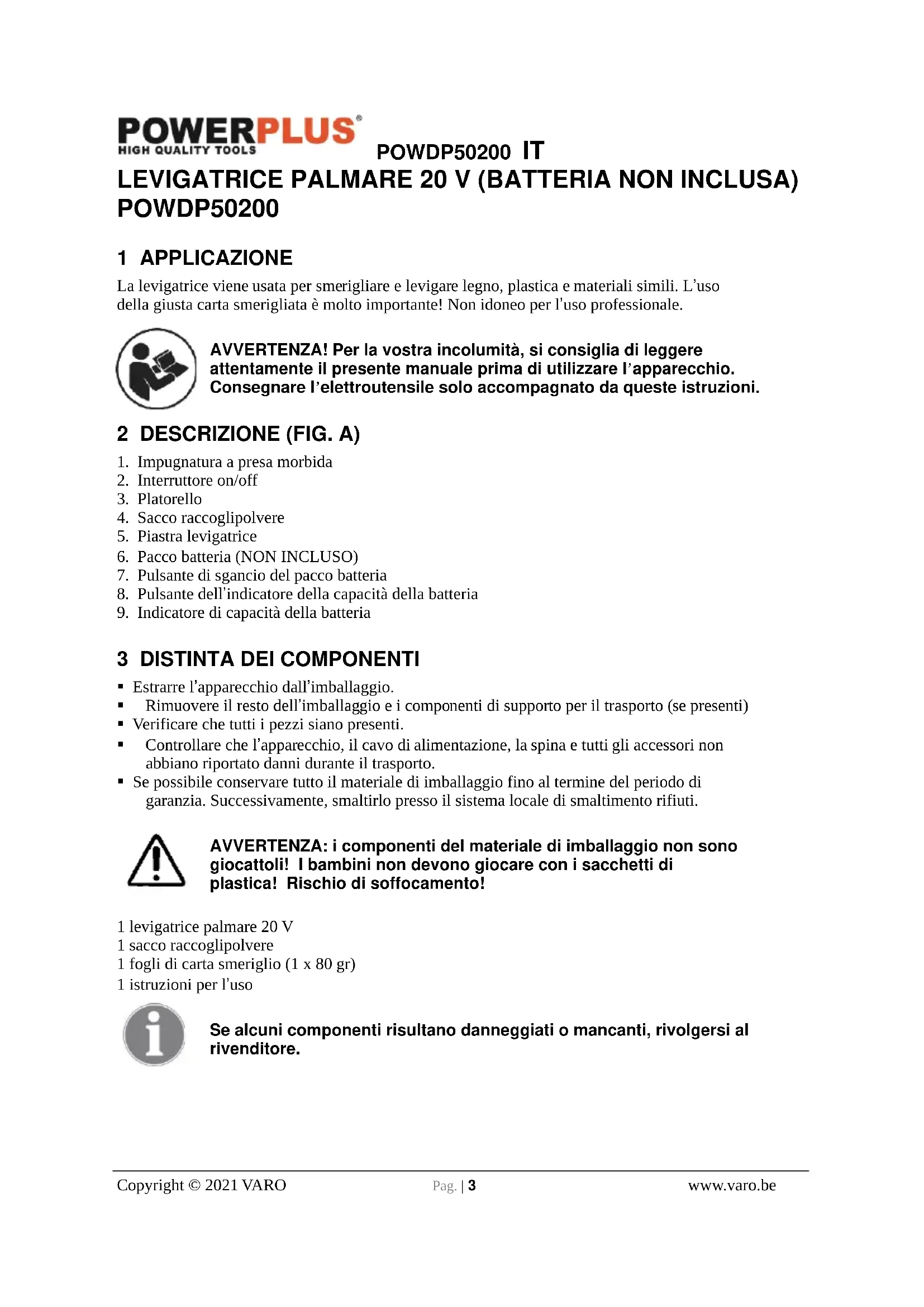 Scarica le istruzioni per il tuo Levigatrice in formato PDF gratuitamente! Trova il tuo manuale POWDP50200 - PowerPlus e riprendi in mano il tuo dispositivo elettronico. In questa pagina sono pubblicati tutti i documenti necessari per l'utilizzo del tuo dispositivo. POWDP50200 del marchio PowerPlus.