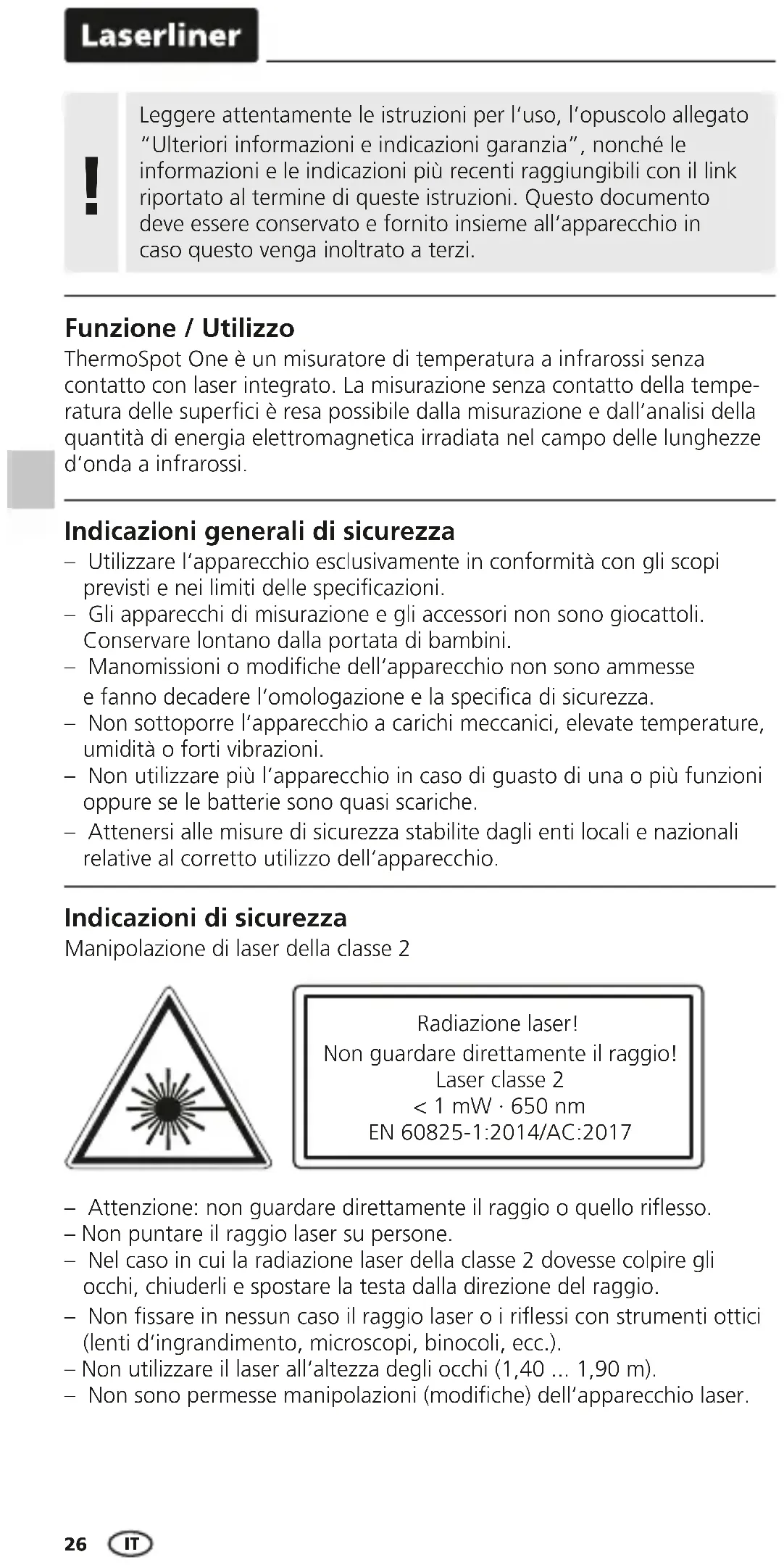 Funzione / Utilizzo ThermoSpot One è un misuratore di temperatura a infrarossi senza contatto con laser integrato. La misurazione senza contatto della tempe- ratura delle superci è resa possibile dalla misurazione e dall’analisi della quantità di energia elettromagnetica irradiata nel campo delle lunghezze d‘onda a infrarossi. – Attenzione: non guardare direttamente il raggio o quello riesso. – Non puntare il raggio laser su persone. – Nel caso in cui la radiazione laser della classe 2 dovesse colpire gli occhi, chiuderli e spostare la testa dalla direzione del raggio. – Non ssare in nessun caso il raggio laser o i riessi con strumenti ottici (lenti d‘ingrandimento, microscopi, binocoli, ecc.). – Non utilizzare il laser all‘altezza degli occhi (1,40 ... 1,90 m). – Non sono permesse manipolazioni (modiche) dell‘apparecchio laser. Indicazioni di sicurezza Manipolazione di laser della classe 2 Indicazioni generali di sicurezza – Utilizzare l‘apparecchio esclusivamente in conformità con gli scopi previsti e nei limiti delle specicazioni. – Gli apparecchi di misurazione e gli accessori non sono giocattoli. Conservare lontano dalla portata di bambini. – Manomissioni o modiche dell‘apparecchio non sono ammesse e fanno decadere l‘omologazione e la specica di sicurezza. – Non sottoporre l‘apparecchio a carichi meccanici, elevate temperature, umidità o forti vibrazioni. – Non utilizzare più l‘apparecchio in caso di guasto di una o più funzioni oppure se le batterie sono quasi scariche. – Attenersi alle misure di sicurezza stabilite dagli enti locali e nazionali relative al corretto utilizzo dell‘apparecchio. Leggere attentamente le istruzioni per l‘uso, l’opuscolo allegato “Ulteriori informazioni e indicazioni garanzia”, nonché le informazioni e le indicazioni più recenti raggiungibili con il link riportato al termine di queste istruzioni. Questo documento deve essere conservato e fornito insieme all‘apparecchio in caso questo venga inoltrato a terzi.