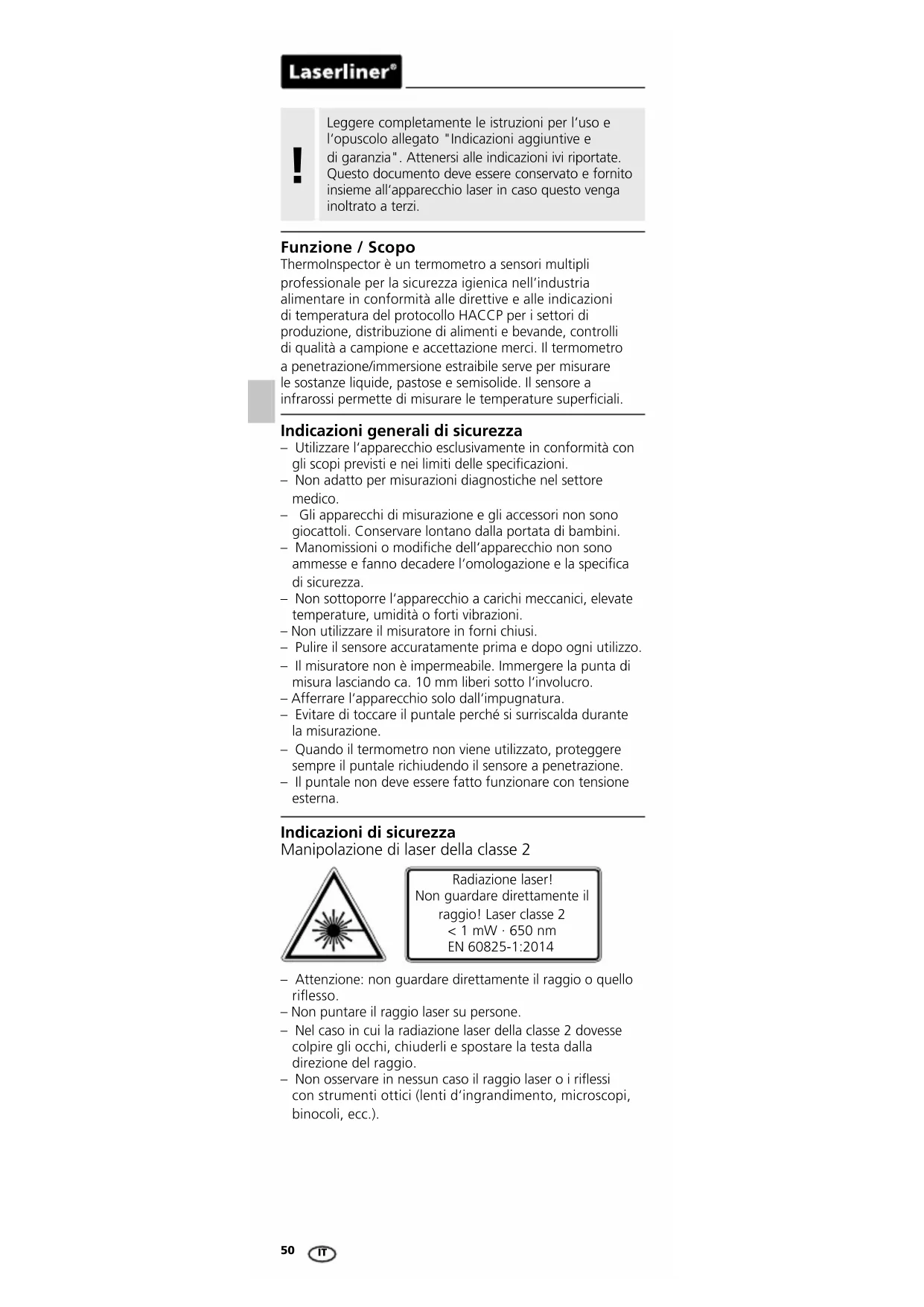 Funzione / Scopo ThermoInspector è un termometro a sensori multipli professionale per la sicurezza igienica nell’industria alimentare in conformità alle direttive e alle indicazioni di temperatura del protocollo HACCP per i settori di produzione, distribuzione di alimenti e bevande, controlli di qualità a campione e accettazione merci. Il termometro a penetrazione/immersione estraibile serve per misurare le sostanze liquide, pastose e semisolide. Il sensore a infrarossi permette di misurare le temperature superciali. Indicazioni generali di sicurezza – Utilizzare l‘apparecchio esclusivamente in conformità con gli scopi previsti e nei limiti delle specicazioni. – Non adatto per misurazioni diagnostiche nel settore medico. – Gli apparecchi di misurazione e gli accessori non sono giocattoli. Conservare lontano dalla portata di bambini. – Manomissioni o modiche dell‘apparecchio non sono ammesse e fanno decadere l‘omologazione e la specica di sicurezza. – Non sottoporre l‘apparecchio a carichi meccanici, elevate temperature, umidità o forti vibrazioni. – Non utilizzare il misuratore in forni chiusi. – Pulire il sensore accuratamente prima e dopo ogni utilizzo. – Il misuratore non è impermeabile. Immergere la punta di misura lasciando ca. 10 mm liberi sotto l‘involucro. – Afferrare l‘apparecchio solo dall‘impugnatura. – Evitare di toccare il puntale perché si surriscalda durante la misurazione. – Quando il termometro non viene utilizzato, proteggere sempre il puntale richiudendo il sensore a penetrazione. – Il puntale non deve essere fatto funzionare con tensione esterna. Indicazioni di sicurezza Manipolazione di laser della classe 2 Radiazione laser! Non guardare direttamente il raggio! Laser classe 2 < 1 mW · 650 nm EN 60825-1:2014 – Attenzione: non guardare direttamente il raggio o quello riesso. – Non puntare il raggio laser su persone. – Nel caso in cui la radiazione laser della classe 2 dovesse colpire gli occhi, chiuderli e spostare la testa dalla direzione del raggio. – Non osservare in nessun caso il raggio laser o i riessi con strumenti ottici (lenti d‘ingrandimento, microscopi, binocoli, ecc.).ThermoInspector