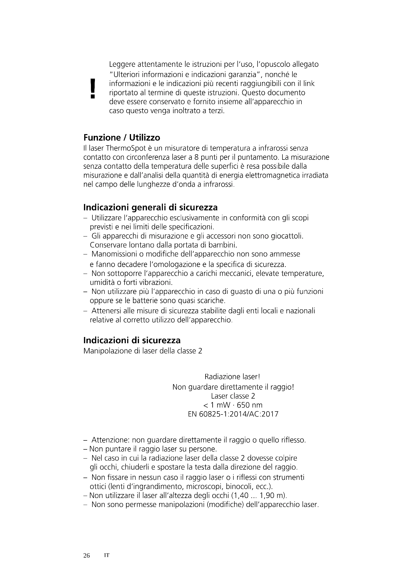 Funzione / Utilizzo Il laser ThermoSpot è un misuratore di temperatura a infrarossi senza contatto con circonferenza laser a 8 punti per il puntamento. La misurazione senza contatto della temperatura delle superci è resa possibile dalla misurazione e dall’analisi della quantità di energia elettromagnetica irradiata nel campo delle lunghezze d‘onda a infrarossi. – Attenzione: non guardare direttamente il raggio o quello riesso. – Non puntare il raggio laser su persone. – Nel caso in cui la radiazione laser della classe 2 dovesse colpire gli occhi, chiuderli e spostare la testa dalla direzione del raggio. – Non ssare in nessun caso il raggio laser o i riessi con strumenti ottici (lenti d‘ingrandimento, microscopi, binocoli, ecc.). – Non utilizzare il laser all‘altezza degli occhi (1,40 ... 1,90 m). – Non sono permesse manipolazioni (modiche) dell‘apparecchio laser. Indicazioni di sicurezza Manipolazione di laser della classe 2 Indicazioni generali di sicurezza – Utilizzare l‘apparecchio esclusivamente in conformità con gli scopi previsti e nei limiti delle specicazioni. – Gli apparecchi di misurazione e gli accessori non sono giocattoli. Conservare lontano dalla portata di bambini. – Manomissioni o modiche dell‘apparecchio non sono ammesse e fanno decadere l‘omologazione e la specica di sicurezza. – Non sottoporre l‘apparecchio a carichi meccanici, elevate temperature, umidità o forti vibrazioni. – Non utilizzare più l‘apparecchio in caso di guasto di una o più funzioni oppure se le batterie sono quasi scariche. – Attenersi alle misure di sicurezza stabilite dagli enti locali e nazionali relative al corretto utilizzo dell‘apparecchio. Leggere attentamente le istruzioni per l‘uso, l’opuscolo allegato “Ulteriori informazioni e indicazioni garanzia”, nonché le informazioni e le indicazioni più recenti raggiungibili con il link riportato al termine di queste istruzioni. Questo documento deve essere conservato e fornito insieme all‘apparecchio in caso questo venga inoltrato a terzi.