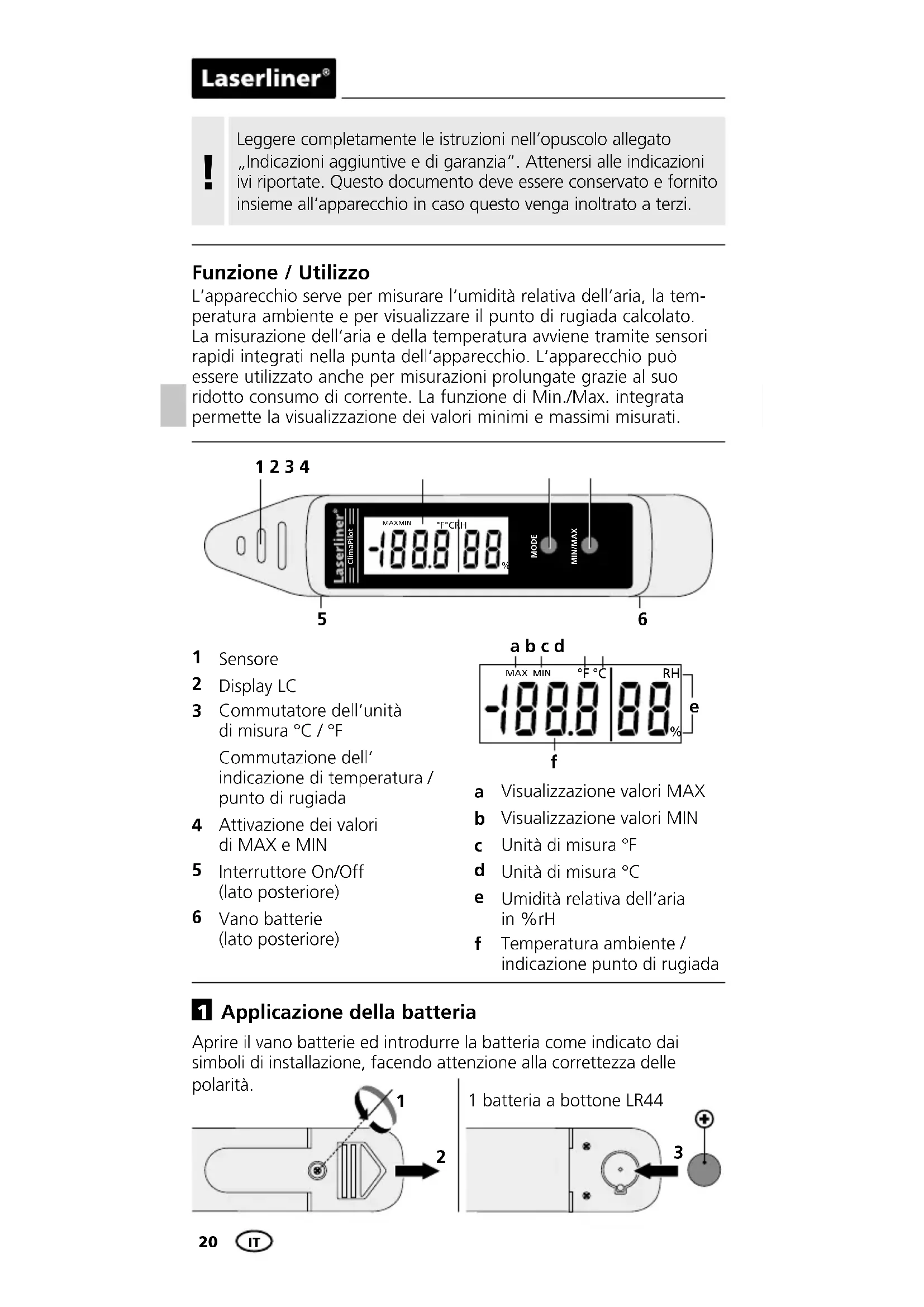 Applicazione della batteria Aprire il vano batterie ed introdurre la batteria come indicato dai simboli di installazione, facendo attenzione alla correttezza delle polarità. 1 batteria a bottone LR44 ITClimaPilot