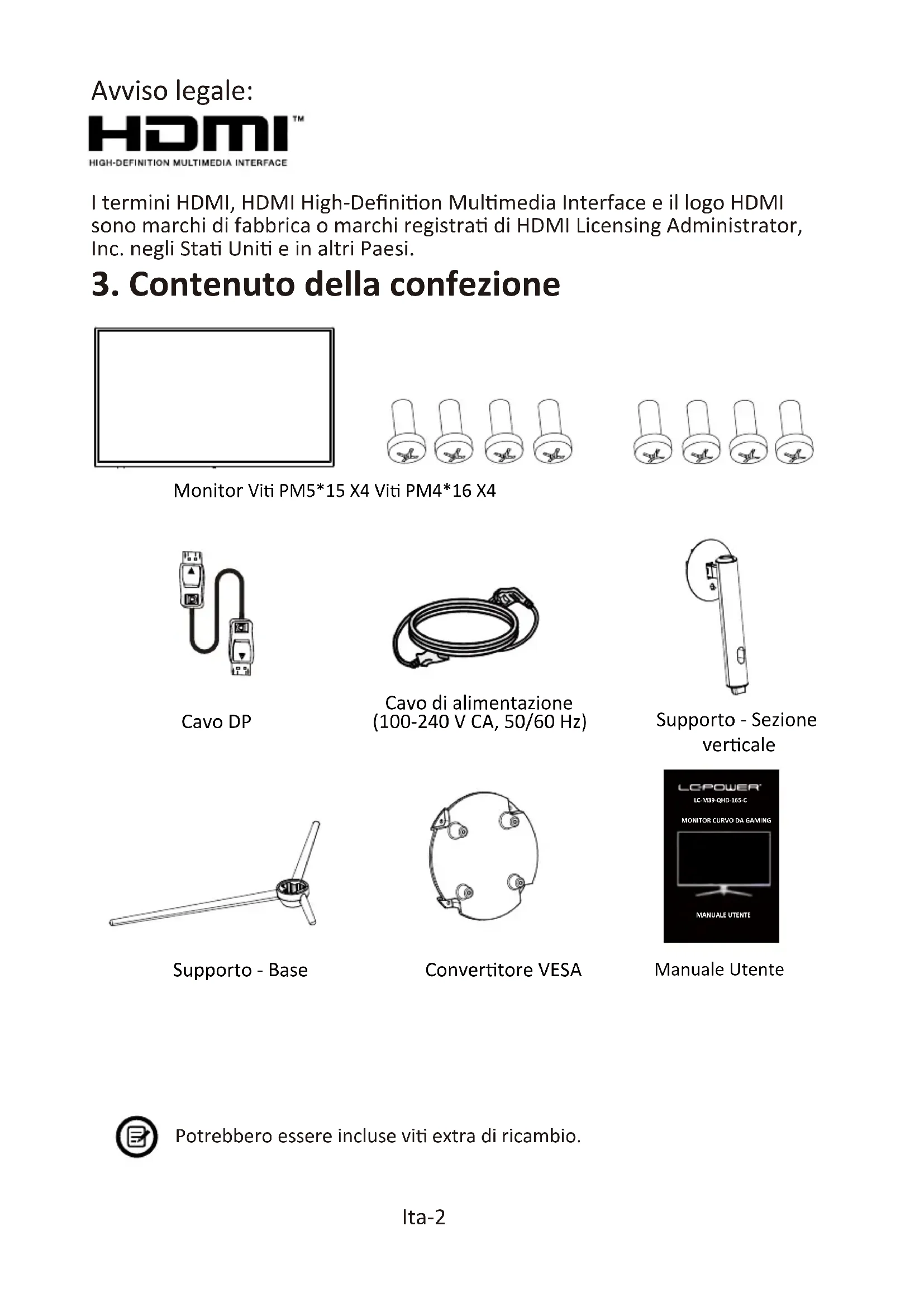 Manuale UtenteConvertore VESAPotrebbero essere incluse vi extra di ricambio.LC-M39-QHD-165-CMONITOR CURVO DA GAMINGMANUALE UTENTE I termini HDMI, HDMI High-Definion Mulmedia Interface e il logo HDMI sono marchi di fabbrica o marchi registra di HDMI Licensing Administrator, Inc. negli Sta Uni e in altri Paesi.4. Descrizione del prodoo