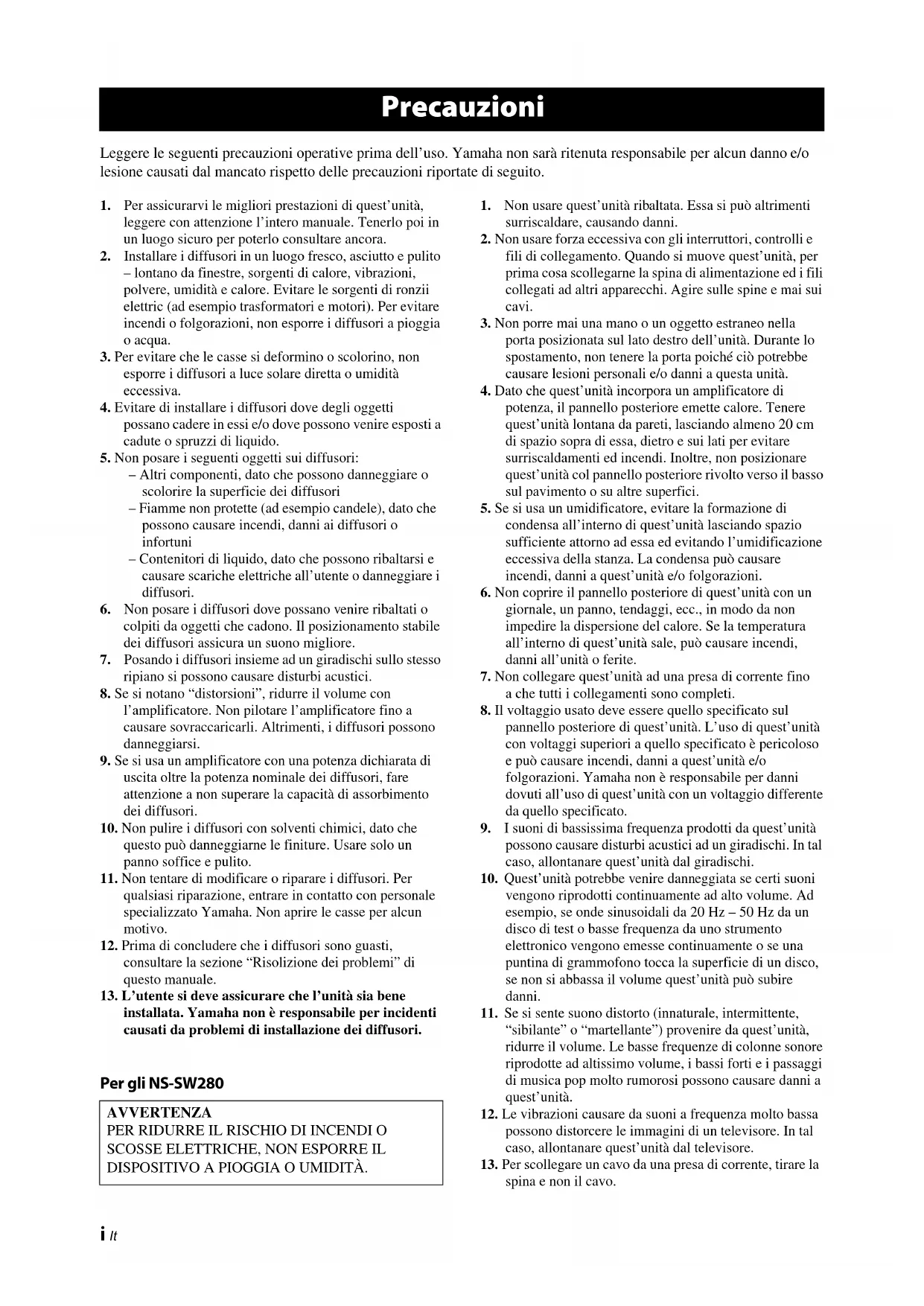 100 dBNS-SW280NS-C385 Problema Causa possibile SoluzioneL’interruttore POWER è impostato su ON ma il subwoofer non funziona.Il cavo dell’alimentazione non è collegato correttamente.Impostate l’interruttore POWER su OFF quindi accertatevi che il cavo dell’alimentazione sia collegato correttamente.Non viene emesso alcun suono.Il controllo VOLUME è impostato su 0.Alzate il controllo VOLUME.Il cavo del subwoofer non è collegato correttamente.Accertatevi che il cavo del subwoofer sia collegato correttamente.Il subwoofer non si sente molto.Il materiale della sorgente non contiene molti bassi.Provate a riprodurre un materiale che contenga più bassi.I bassi vengono annullati dalle onde stazionarie.Riposizionate il subwoofer oppure, per eliminare questo effetto dovuto alle pareti parallele, appendete mensole o oggetti di grandi dimensioni alla parete.6 It Italiano ■ Altoparlanti anteriori, surround (NS-B285) e altoparlante centro (NS-C385) Tipo NS-B285....Sistema di altoparlanti full range a sospensione pneumatica, tipo non a schermatura magneticaNS-C385.....Sistema di altoparlanti a due vie a sospensione pneumatica, tipo non a schermatura magnetica DriverNS-B285................................. Altoparlante a cono da 6,5 cmNS-C385............ Woofer: Altoparlante a cono x 2 da 6,5 cmTweeter: a cupola bilanciata da 2,5 cmPotenza nominale d’ingressoNS-B285............................................................................ 30 WNS-C385............................................................................ 50 WPotenza d’ingresso massimaNS-B285............................................................................ 80 WNS-C385.......................................................................... 100 W Impedenza ............................................................................. 6 Ω Risposta di frequenza..................................... 110 Hz–40 kHz Sensibilità NS-B285.......................................................81 dB/2,83 V, 1 mNS-C385.......................................................84 dB/2,83 V, 1 mFrequenza di transizione NS-C385........................................................................... 8 kHz Dimensioni (L x A x P)NS-B285........................ 90 x 90 x 109 mm (senza supporto)90 x 120 x 123 mm (con supporto)NS-C385........................................................ 220 x 90 x 109 mm Peso NS-B285...........................................0,45 kg (senza supporto)NS-C385 .......................................................................... 1,0 kg ■ Subwoofer (NS-SW280) Tipo ......................Advanced Ya m a h a Active Servo Technology Driver .................................................. woofer a cono da 16 cm tipo non a schermatura magnetica Potenza erogata ................................................................. 50 W (100 Hz, 5 , 10% di distorsione armonica totale) Potenza dinamica .................................................... 100 W, 5 Impedenza ingresso..........INPUT (1jack P a pin RCA): 10 k Risposta di frequenza........................................30 Hz–160 Hz Sensibilità ingresso...................INPUT (1jack P a pin RCA):80 mV (50 Hz, 50 W/5 Ω)Alimentazione Modelli USA e Canada ................................CA 120 V, 60 Hz Modello Australia.........................................CA 240 V, 50 HzModelli Regno Unito ed Europa.................CA 230 V, 50 HzModelli per Cina, Corea, Asia e modelli generali ............. CA 110–120/220–240 V, 50/60 Hz Dimensioni (L x A x P) ...........................262 x 264 x 316 mm Peso ..................................................................................... 6,9 kg Le caratteristiche tecniche sono soggette a modifica senza preavviso. Garanzia limitata per l’Area Economica Europea (AEE) e la Svizzera Vi ringraziamo per aver scelto un prodotto Yamaha. Nel caso raro in cui il vostro prodotto abbia bisogno di riparazioni in garanzia, entrare in contatto con il negozio in cui era stato acquistato. Se si avessero difficoltà, entrare in contatto con il rappresentante di Yamaha per il proprio paese. Sono disponibili maggiori dettagli nel nostro sito (http://www.yamaha-hifi.com/ o http://www.yamaha-uk.com/, per i residenti nel Regno Unito). Il prodotto viene garantito esente da difetti di fabbricazione e di materiali per un periodo di due anni a partire dalla data di acquisto originale. Yamaha si impegna, entro i limiti delle condizioni illustrate di seguito, a riparare (o sostituire, a discrezione esclusiva di Yamaha) il prodotto difettoso o qualsiasi sua parte senza alcun addebito per le parti o per il lavoro. Yamaha si riserva il diritto di sostituire un prodotto con uno di tipo, valore e/o condizione simile nel caso un modello particolare non sia più in produzione o sia considerato troppo costoso da riparare. Condizioni della garanzia 1. La fattura o ricevuta originale di pagamento (recante la data di acquisto, il numero di codice del prodotto e il nome del negozio di acquisto) DEVE accompagnare sempre il prodotto difettoso unita ad una dichiarazione descrivente il problema accusato. In mancanza di prova esaustiva dell’avvenuto acquisto, Yamaha si riserva in diritto di rifiutare di fornire riparazioni gratuite ed il prodotto può venire restituito a spese dell’utente. 2. Il prodotto DEVE esser stato acquistato da un rivenditore Yamaha AUTORIZZATO all’interno dell’Area Economica Europea (EEA) o in Svizzera.