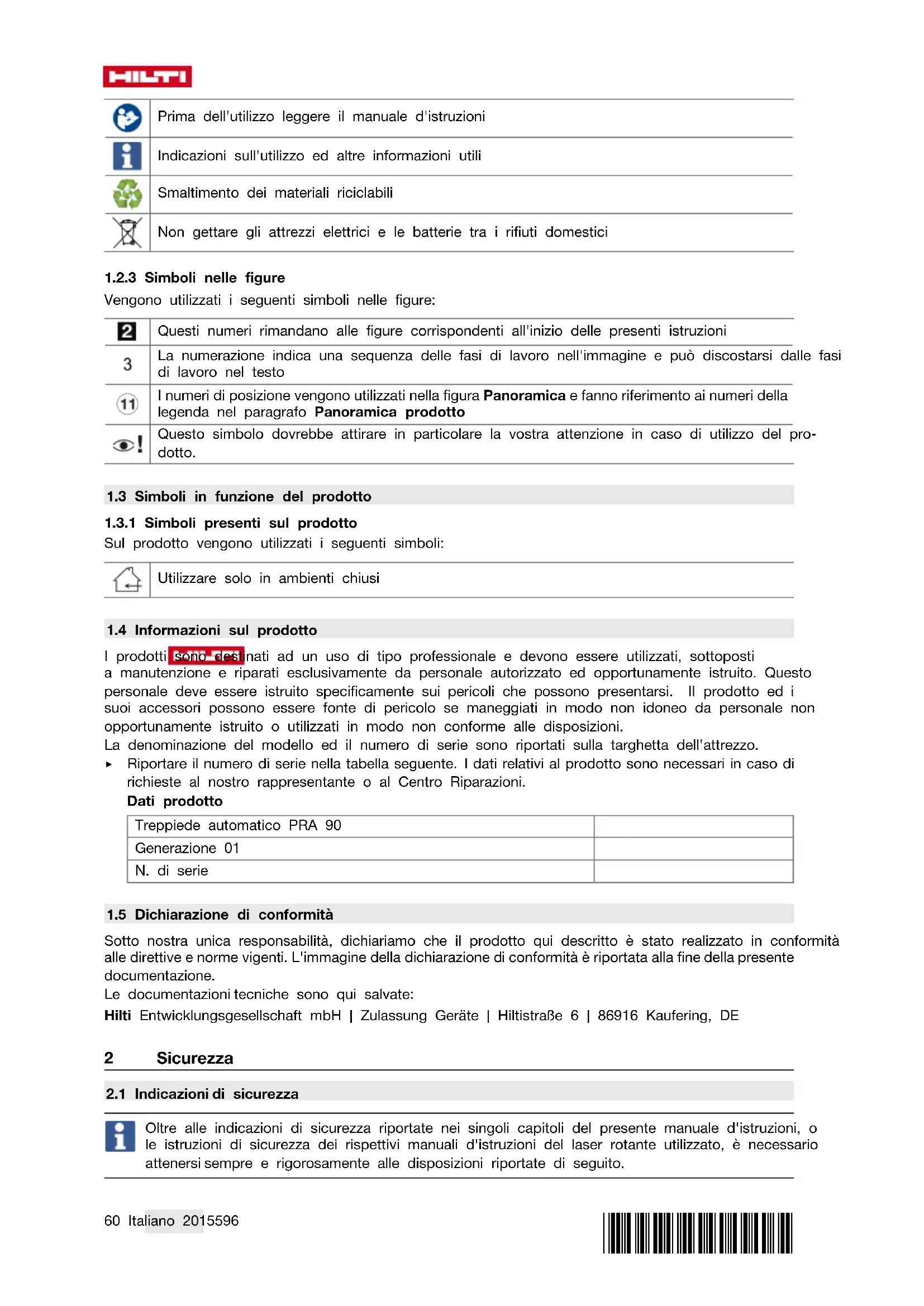 Sotto nostra unica responsabilità, dichiariamo che il prodotto qui descritto è stato realizzato in conformità alle direttive e norme vigenti. L'immagine della dichiarazione di conformità è riportata alla fine della presente documentazione. Le documentazioni tecniche sono qui salvate: Hilti Entwicklungsgesellschaft mbH | Zulassung Geräte | Hiltistraße 6 | 86916 Kaufering, DE 2 Sicurezza