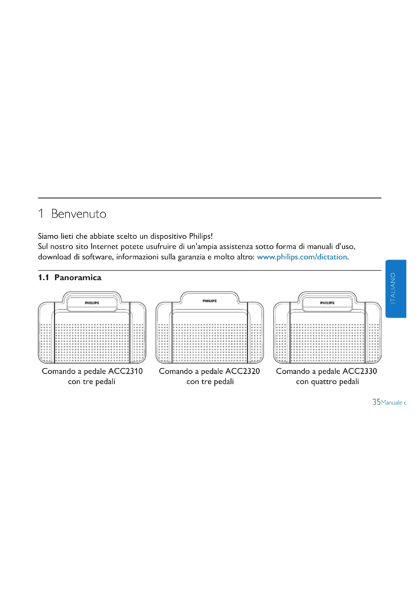2 335Manuale di istruzioni ITALIANO 1 Benvenuto Siamo lieti che abbiate scelto un dispositivo Philips! Sul nostro sito Internet potete usufruire di un’ampia assistenza sotto forma di manuali d’uso, download di software, informazioni sulla garanzia e molto altro: www.philips.com/dictation.