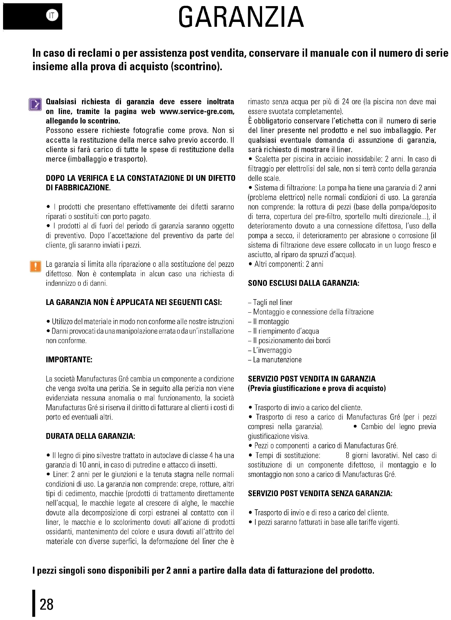 - Tempi di sostituzione: 8 giorni lavorativi. Nel caso di sostituzione di un componente difettoso, il montaggio e lo smontaggio non sono a carico di Manufacturas Gré. SERVIZIO POST VENDITA SENZA GARANZIA: