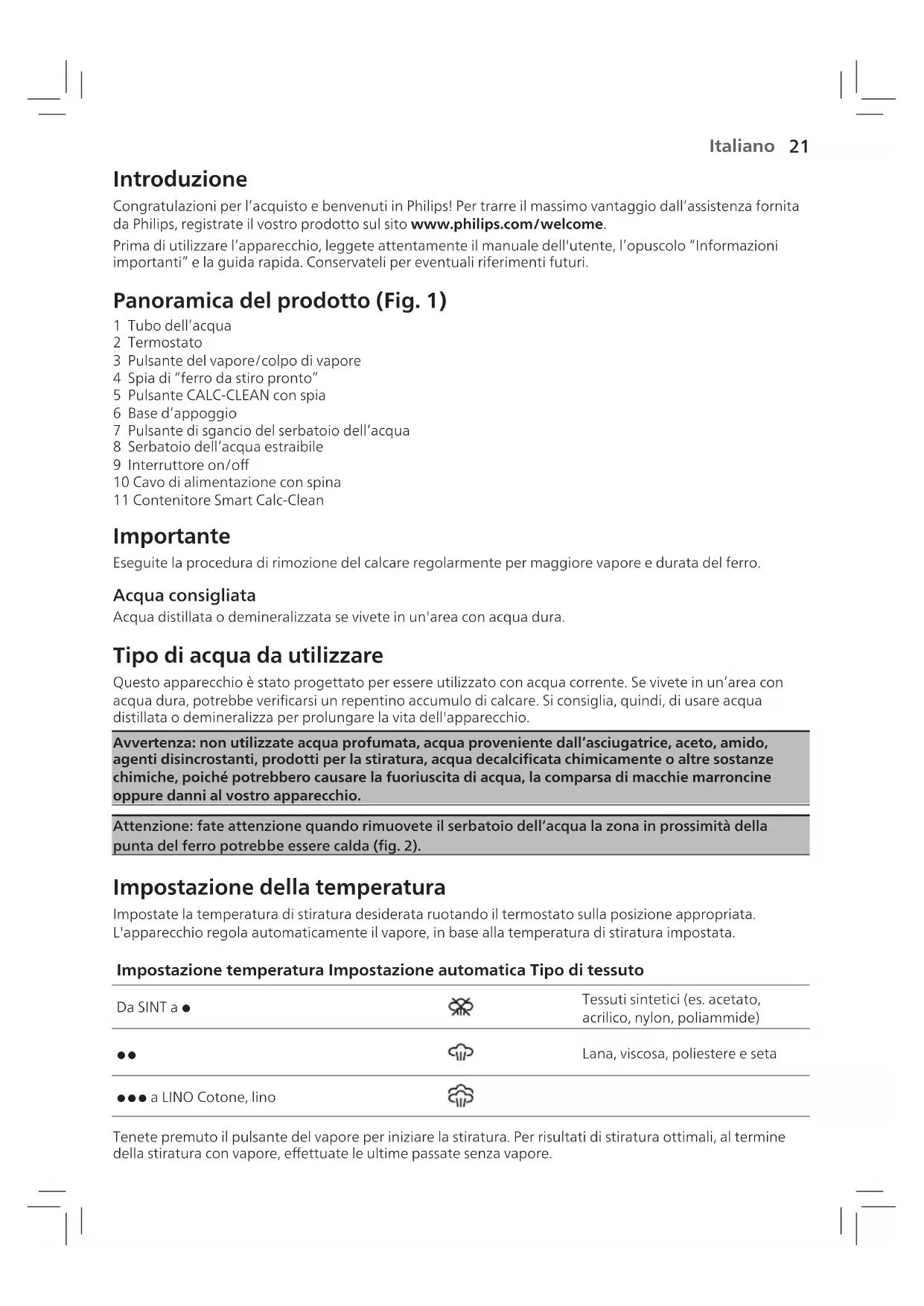 1 Tubo dell’acqua 2 Termostato 3 Pulsante del vapore/colpo di vapore 4 Spia di “ferro da stiro pronto” 5 Pulsante CALC-CLEAN con spia 6 Base d‘appoggio 7 Pulsante di sgancio del serbatoio dell‘acqua 8 Serbatoio dell‘acqua estraibile 9 Interruttore on/o 10 Cavo di alimentazione con spina 11 Contenitore Smart Calc-Clean Importante Eseguite la procedura di rimozione del calcare regolarmente per maggiore vapore e durata del ferro.