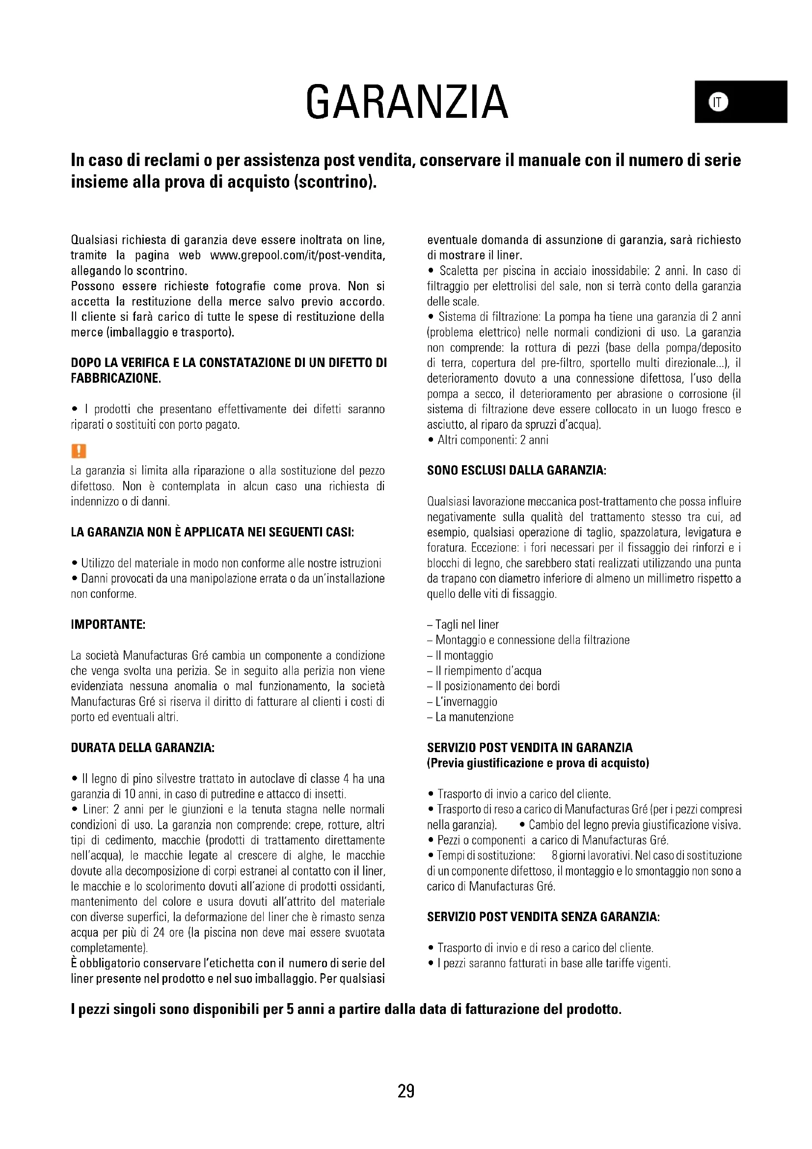 - Liner: 2 anni per le giunzioni e la tenuta stagna nelle normali condizioni di uso. La garanzia non comprende: crepe, rotture, altri tipi di cedimento, macchie (prodotti di trattamento direttamente nell’acqua), le macchie legate al crescere di alghe, le macchie dovute alla decomposizione di corpi estranei al contatto con il liner, le macchie e lo scolorimento dovuti all’azione di prodotti ossidanti, mantenimento del colore e usura dovuti all’attrito del materiale con diverse superfici, la deformazione del liner che è rimasto senza acqua per più di 24 ore (la piscina non deve mai essere svuotata completamente). È obbligatorio conservare l’etichetta con il numero di serie del liner presente nel prodotto e nel suo imballaggio. Per qualsiasi GARANZIA In caso di reclami o per assistenza post vendita, conservare il manuale con il numero di serie insieme alla prova di acquisto (scontrino). I pezzi singoli sono disponibili per 5 anni a partire dalla data di fatturazione del prodotto.30 INTRODUZIONE