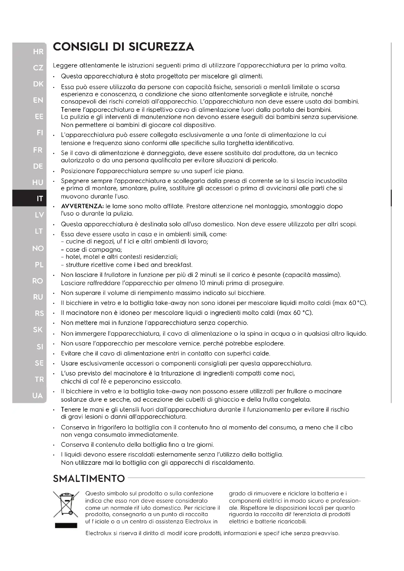 Questa apparecchiatura è stata progettata per miscelare gli alimenti. Essa può essere utilizzata da persone con capacità fisiche, sensoriali o mentali limitate o scarsa esperienza e conoscenza, a condizione che siano attentamente sorvegliate e istruite, nonché consapevoli dei rischi correlati all’apparecchio. L’apparecchiatura non deve essere usata dai bambini. Tenere l’apparecchiatura e il rispettivo cavo di alimentazione fuori dalla portata dei bambini. La pulizia e gli interventi di manutenzione non devono essere eseguiti dai bambini senza supervisione. Non permettere ai bambini di giocare col dispositivo. L'apparecchiatura può essere collegata esclusivamente a una fonte di alimentazione la cui tensione e frequenza siano conformi alle specif iche sulla targhetta identif icativa. Se il cavo di alimentazione è danneggiato, deve essere sostituito dal produttore, da un tecnico autorizzato o da una persona qualificata per evitare situazioni di pericolo. Posizionare l’apparecchiatura sempre su una superf icie piana. Spegnere sempre l'apparecchiatura e scollegarla dalla presa di corrente se la si lascia incustodita e prima di montare, smontare, pulire, sostituire gli accessori o prima di avvicinarsi alle parti che si muovono durante l'uso. AVVERTENZA: le lame sono molto af f ilate. Prestare attenzione nel montaggio, smontaggio dopo l'uso o durante la pulizia. Questa apparecchiatura è destinata solo all'uso domestico. Non deve essere utilizzata per altri scopi. Essa deve essere usata in casa e in ambienti simili, come: – cucine di negozi, uf f ici e altri ambienti di lavoro; – case di campagna; – hotel, motel e altri contesti residenziali; – strutture ricettive come i bed and breakfast. Non lasciare il frullatore in funzione per più di 2 minuti se il carico è pesante (capacità massima). Lasciare raf freddare l’apparecchio per almeno 10 minuti prima di proseguire. Non superare il volume di riempimento massimo indicato sul bicchiere. Il bicchiere in vetro e la bottiglia take-away non sono idonei per mescolare liquidi molto caldi (max 60 °C). Il macinatore non è idoneo per mescolare liquidi o ingredienti molto caldi (max 60 °C). Non mettere mai in funzione l'apparecchiatura senza coperchio. Non immergere l'apparecchiatura, il cavo di alimentazione o la spina in acqua o in qualsiasi altro liquido. Non usare l’apparecchio per mescolare vernice. perché potrebbe esplodere. Evitare che il cavo di alimentazione entri in contatto con superfici calde. Usare esclusivamente accessori o componenti consigliati per questa apparecchiatura. L’uso previsto del macinatore è la triturazione di ingredienti compatti come noci, chicchi di caf fè e peperoncino essiccato. Il bicchiere in vetro e la bottiglia take-away non possono essere utilizzati per frullare o macinare sostanze dure e secche, ad eccezione dei cubetti di ghiaccio e della frutta congelata. Tenere le mani e gli utensili fuori dall'apparecchiatura durante il funzionamento per evitare il rischio di gravi lesioni o danni all'apparecchiatura. Conserva in frigorifero la bottiglia con il contenuto fino al momento del consumo, a meno che il cibo non venga consumato immediatamente. Conserva il contenuto della bottiglia fino a tre giorni. I liquidi devono essere riscaldati esternamente senza l’utilizzo della bottiglia. Non utilizzare mai la bottiglia con gli apparecchi di riscaldamento. SMALTIMENTO Electrolux si riserva il diritto di modif icare prodotti, informazioni e specif iche senza preavviso. Questo simbolo sul prodotto o sulla confezione indica che esso non deve essere considerato come un normale rif iuto domestico. Per riciclare il prodotto, consegnarlo a un punto di raccolta uf f iciale o a un centro di assistenza Electrolux in grado di rimuovere e riciclare la batteria e i componenti elettrici in modo sicuro e profession- ale. Rispettare le disposizioni locali per quanto riguarda la raccolta dif ferenziata di prodotti elettrici e batterie ricaricabili.HR