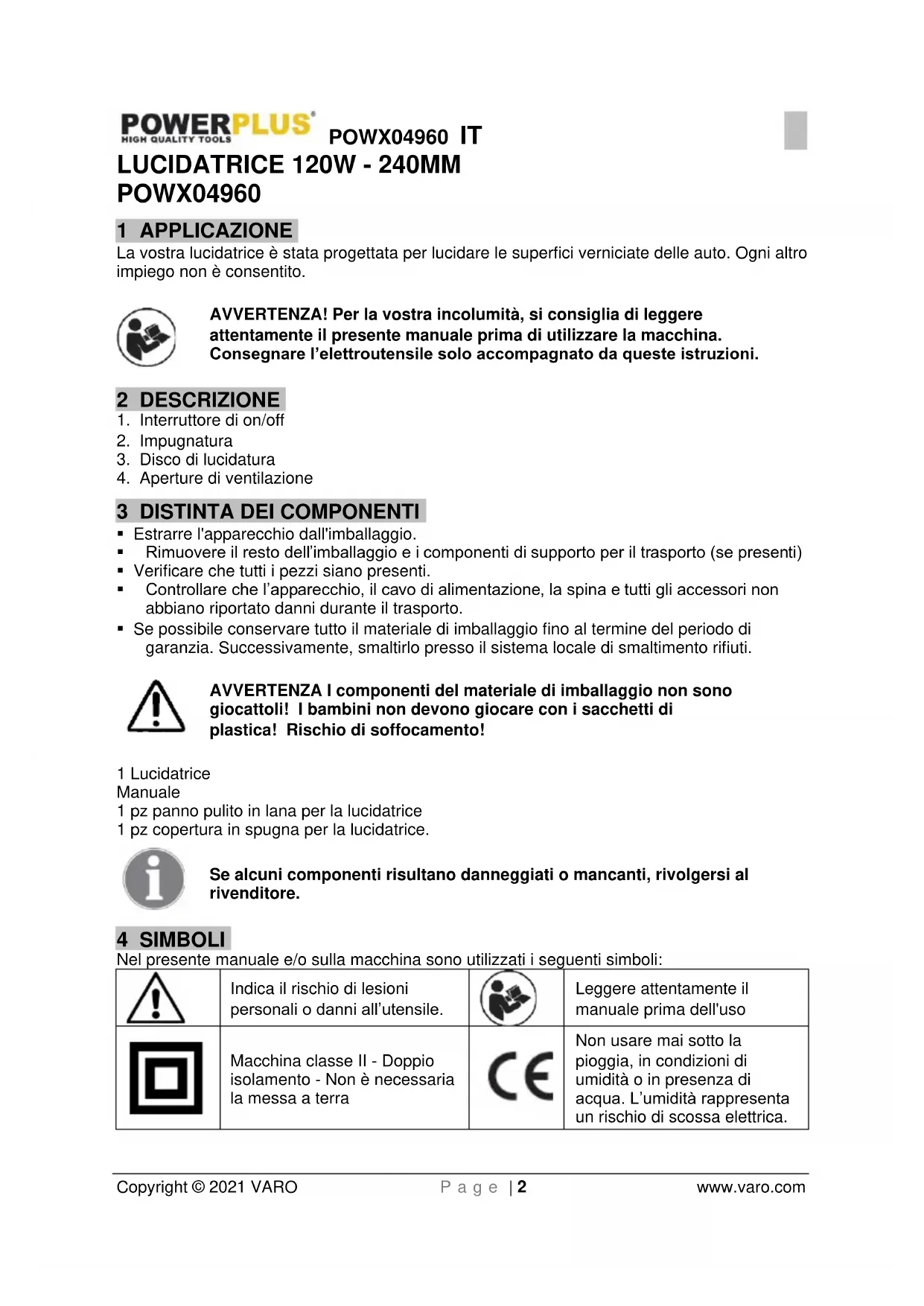 Con la presente, VARO – Vic. Van Rompuy N.V. – Joseph Van Instraat 9 – B2500 Lier, Belgio, dichiara che Descrizione dell’apparecchio: LUCIDATRICE Marchio: PowerPlus Numero articolo: POWX04960 è conforme ai requisiti essenziali e alle altre disposizioni pertinenti stabilite dalle Direttive Europee in base all’applicazione delle norme europee armonizzate. Qualsiasi modifica effettuata sul prodotto rende nulla questa dichiarazione. Direttive europee (inclusi eventuali emendamenti fino alla data della firma); 2011/65/EU 2006/42/EC 2014/30/EU Norme europee armonizzate (inclusi eventuali emendamenti fino alla data della firma); EN62841-1 : 2015 EN62841-2-4 : 2014 EN55014-1 : 2017 EN55014-2 : 2015 EN61000-3-2 : 2014 EN61000-3-3 : 2013 Depositario della documentazione tecnica: Philippe Vankerkhove, VARO – Vic. Van Rompuy N.V. Il sottoscritto agisce in nome e per conto del CEO della società, Ludo Mertens Regulatory Affairs – Compliance Manager 07/09/2021, Lier - BelgiumPOWX04960 PT Copyright © 2021 VARO P a g e | 1 www.varo.com 1 APLICAÇÃO ..................................................................................... 2 2 DESCRIÇÃO .................................................................................... 2