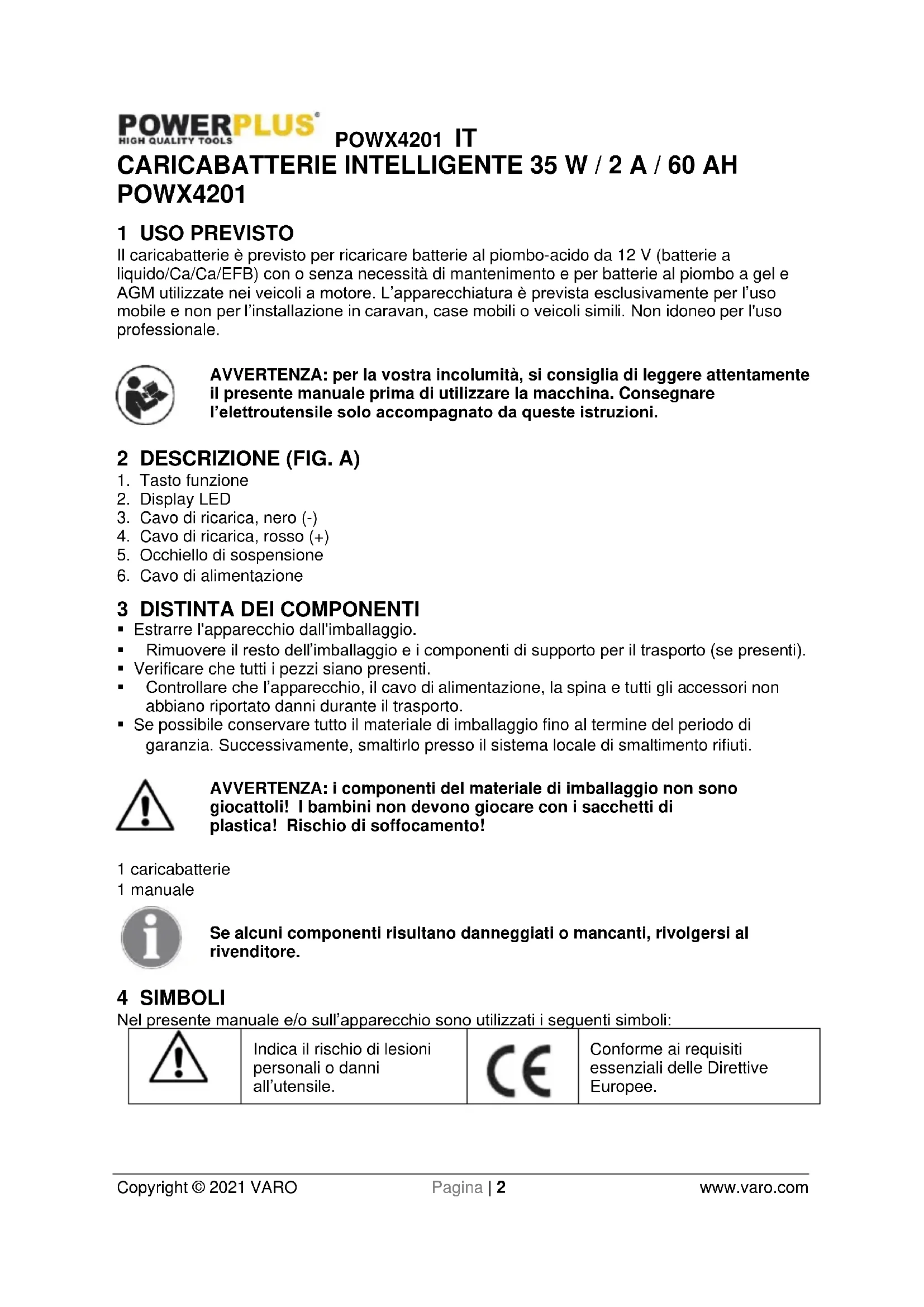 Conforme ai requisiti essenziali delle Direttive Europee.POWX4201 IT Copyright © 2021 VARO Pagina | 3 www.varo.com