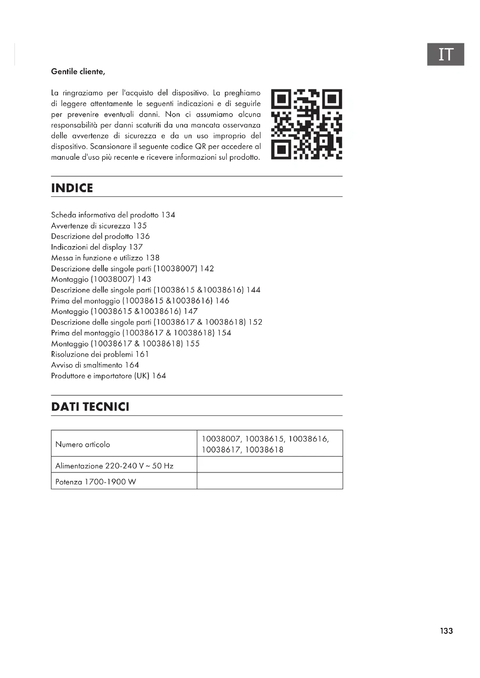 Gentile cliente, La ringraziamo per l'acquisto del dispositivo. La preghiamo di leggere attentamente le seguenti indicazioni e di seguirle per prevenire eventuali danni. Non ci assumiamo alcuna responsabilità per danni scaturiti da una mancata osservanza delle avvertenze di sicurezza e da un uso improprio del dispositivo. Scansionare il seguente codice QR per accedere al manuale d'uso più recente e ricevere informazioni sul prodotto. INDICE Scheda informativa del prodotto134 Avvertenze di sicurezza135 Descrizione del prodotto136 Indicazioni del display137 Messa in funzione e utilizzo138 Descrizione delle singole parti (10038007)142 Montaggio (10038007)143 Descrizione delle singole parti (10038615 &10038616)144 Prima del montaggio (10038615 &10038616)146 Montaggio (10038615 &10038616)147 Descrizione delle singole parti (10038617 & 10038618)152 Prima del montaggio (10038617 & 10038618)154 Montaggio (10038617 & 10038618)155 Risoluzione dei problemi161 Avviso di smaltimento164 Produttore e importatore (UK)164 DATI TECNICI Numero articolo 10038007, 10038615, 10038616, 10038617, 10038618 Alimentazione 220-240 V ~ 50 Hz Potenza 1700-1900 W134