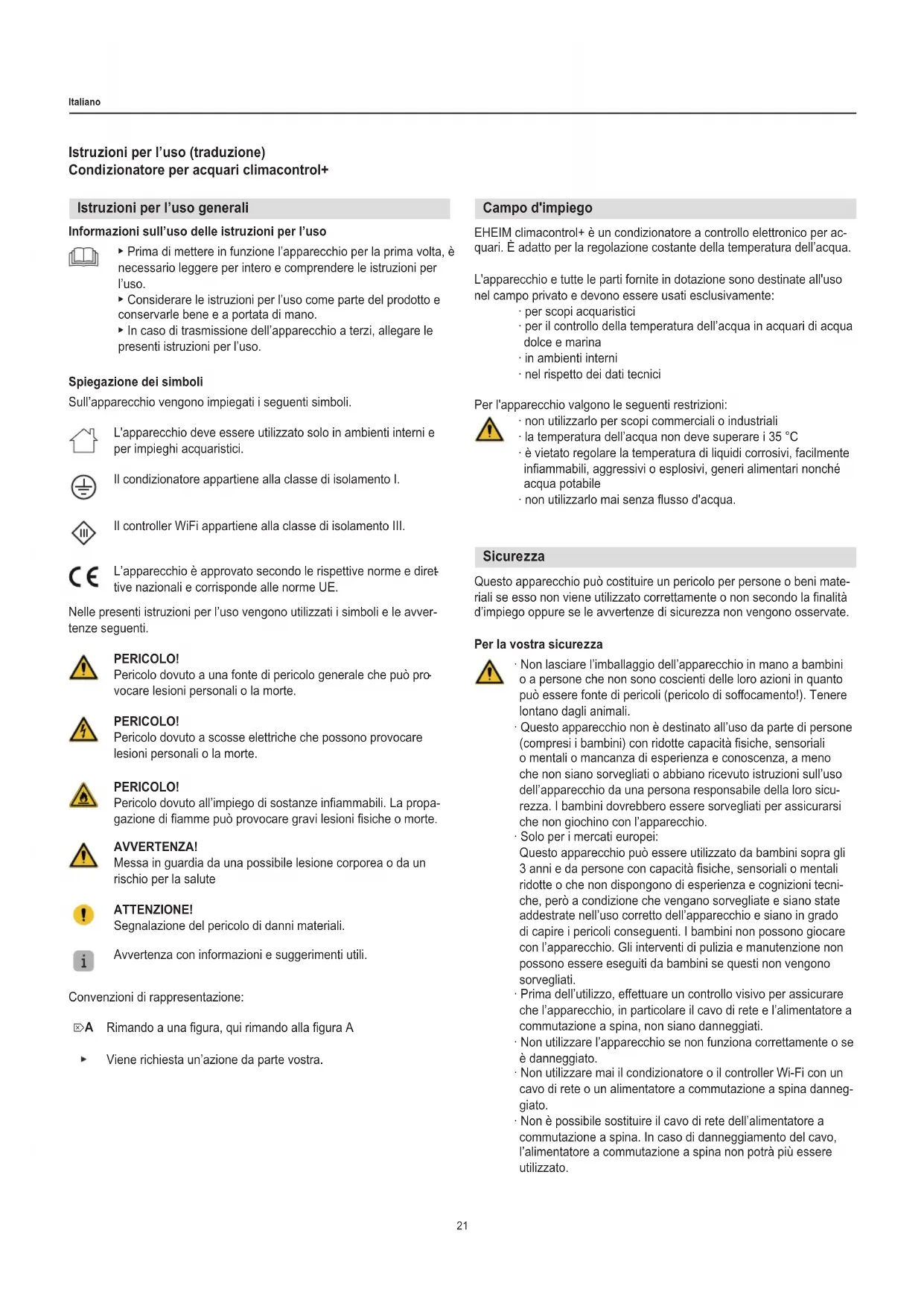 - = détermination des valeurs 1× aquarium avec cache, température ambiante 20°C, Δt = diérence de température entre la température ambiante et la température de l’eau Pièces de rechange Voir page 3.21 Italiano Istruzioni per l’uso (traduzione) Condizionatore per acquari climacontrol+ Istruzioni per l’uso generali Informazioni sull’uso delle istruzioni per l’uso ▶ Prima di mettere in funzione l’apparecchio per la prima volta, è necessario leggere per intero e comprendere le istruzioni per l’uso. ▶ Considerare le istruzioni per l’uso come parte del prodotto e conservarle bene e a portata di mano. ▶ In caso di trasmissione dell’apparecchio a terzi, allegare le presenti istruzioni per l’uso. Spiegazione dei simboli Sull’apparecchio vengono impiegati i seguenti simboli. L'apparecchio deve essere utilizzato solo in ambienti interni e per impieghi acquaristici. Il condizionatore appartiene alla classe di isolamento I. Il controller WiFi appartiene alla classe di isolamento III. L’apparecchio è approvato secondo le rispettive norme e diret